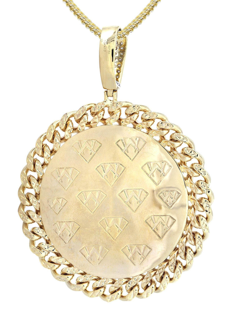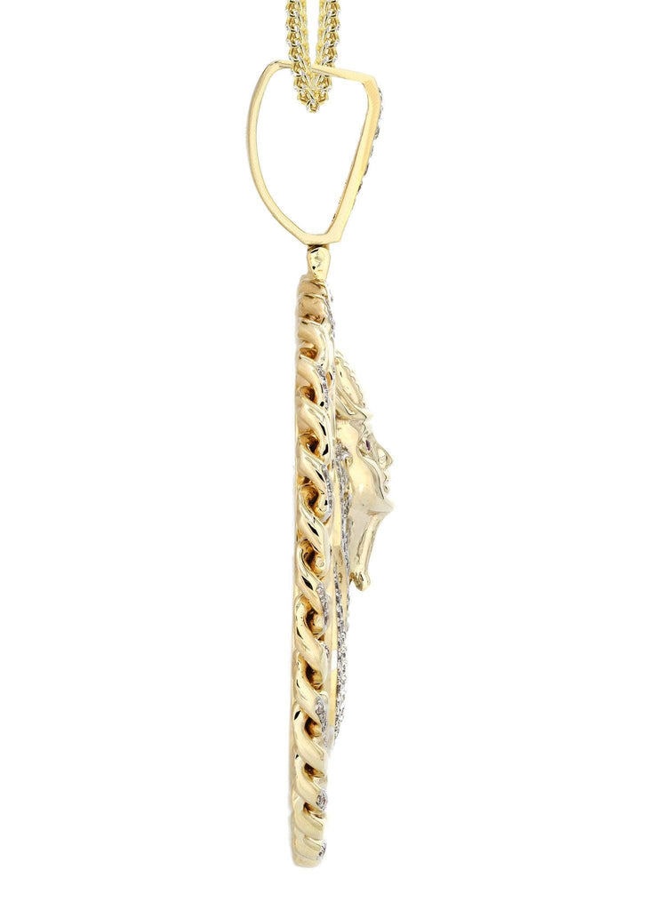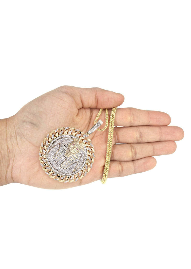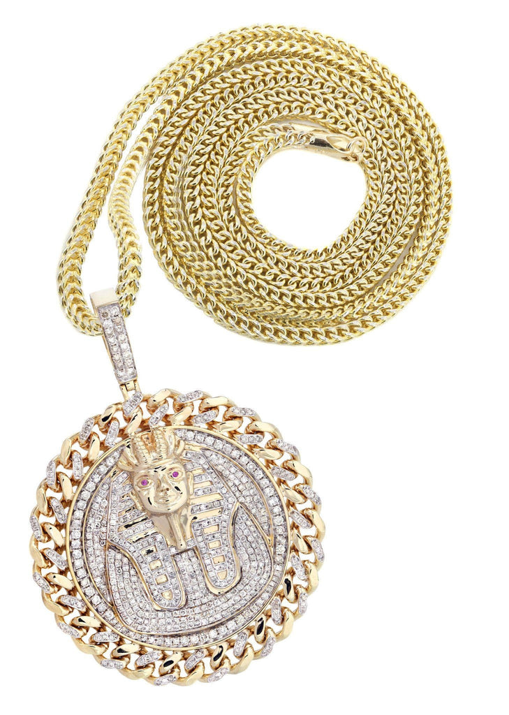 | 10 Yellow Gold Pharaoh Diamond Pendant & Franco Chain which comes in 3 Inches in length and 2.25 Inches in width. The pendant has 4.44 Carats of Vs quality diamonds. The chain options include a 10k gold cuban chain, franco or rope with a width of 3mm's and the length can be selected to any preference. |