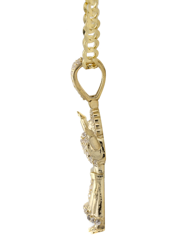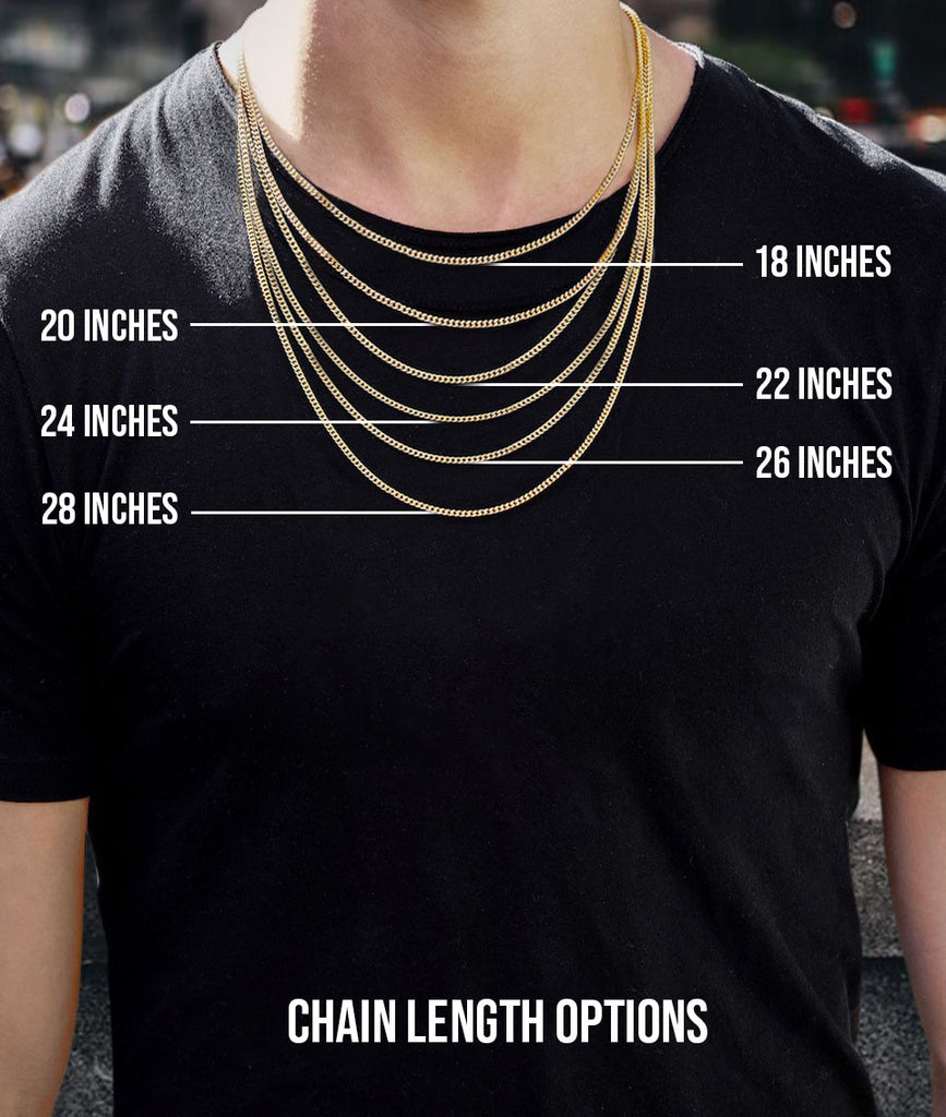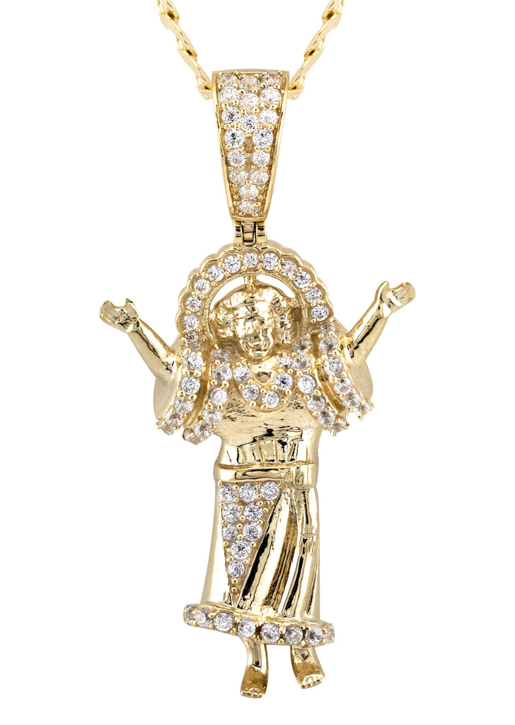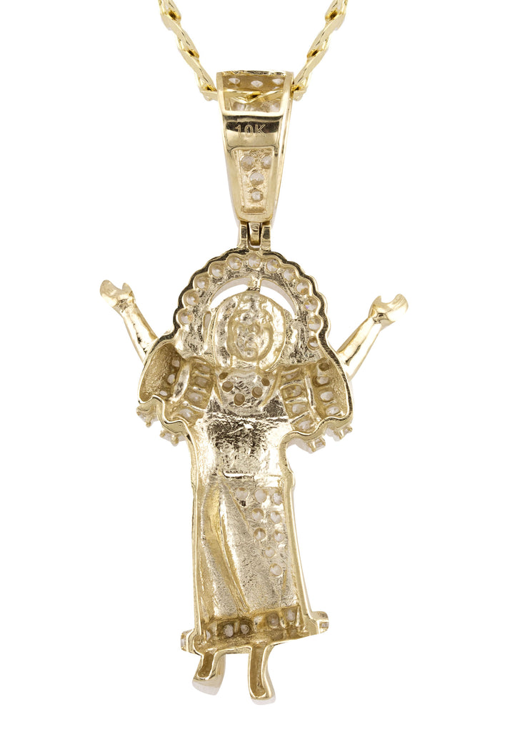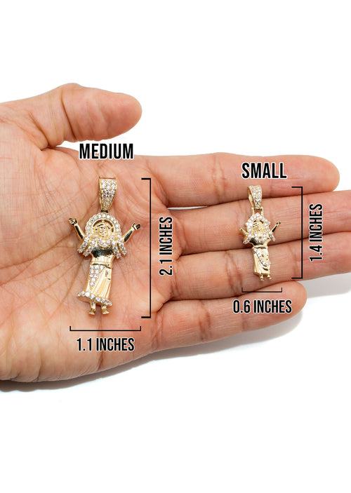 Gold Baby Jesus Piece Necklace which comes in small and large sizes. Small size is 0.6 by 1.4 inches and the large pendant is 1.1 by 2.1 inches. You can select any chain you want to customize your setup. The weight of the necklace will adjust once you select your final options.