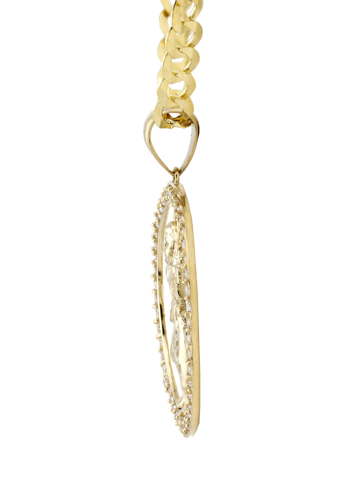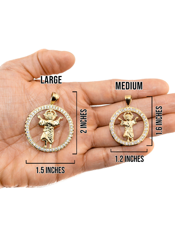 Gold Baby Jesus Piece Necklace which comes in small and large sizes. Small size is 1.2 by 1.6 inches and the large pendant is 1.5 by 2 inches. You can select any chain you want to customize your setup. The weight of the necklace will adjust once you select your final options.