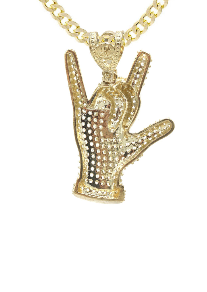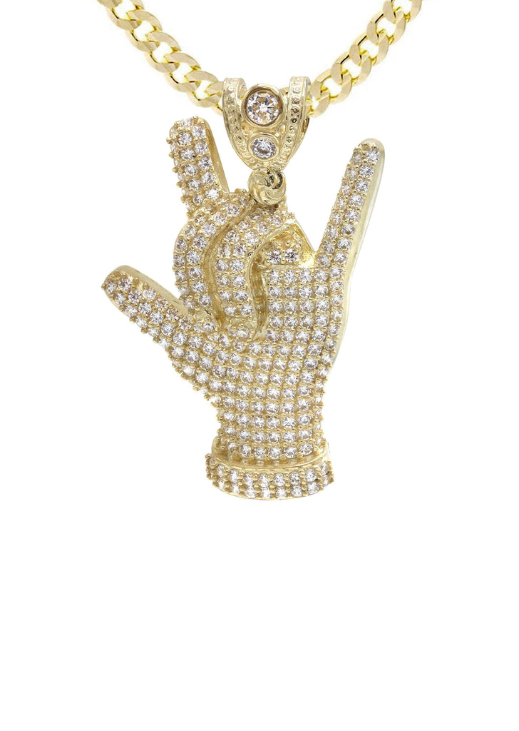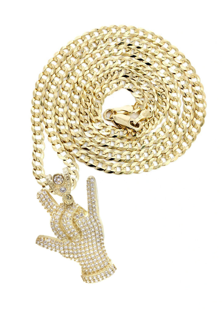 10K Gold Chain And Cz Hand Horns Pendant With An Approximate Total Gram Weight Of 16.4. Pendant Weighs 6.4 Grams And The Chain Weighs 10 Grams. The Pendant Measurement Is 1 inches In Width And A Length Of 1.4 inches. The Width Of The Chain Is 3 Mm The Length And Type Of The Chain Can Be Adjusted.