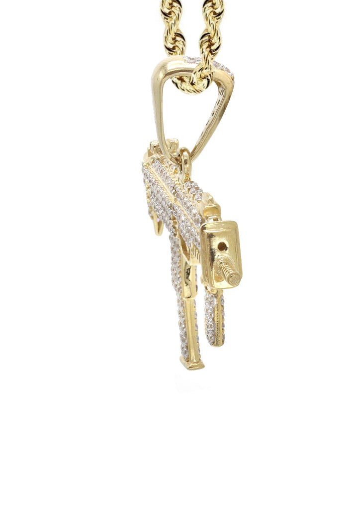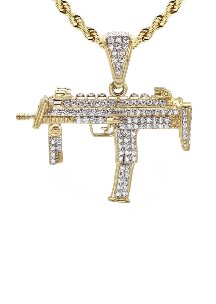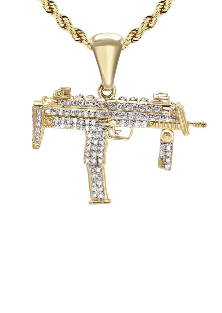 10K Gold Chain And Machine Gun Necklace With An Approximate Total Gram Weight Of 15.6. Pendant Weighs 5.6 Grams And The Chain Weighs 10 Grams. The Pendant Measurement Is 0.8 inches In Width And A Length Of 1.7 inches. The Width Of The Chain Is 3 Mm The Length And Type Of The Chain Can Be Adjusted.