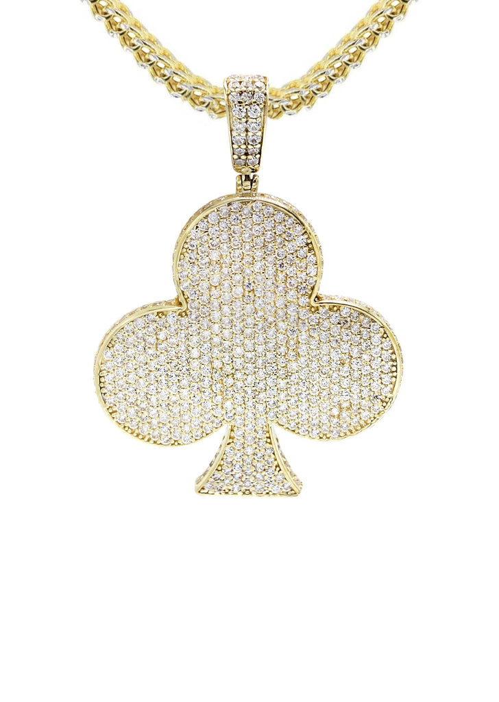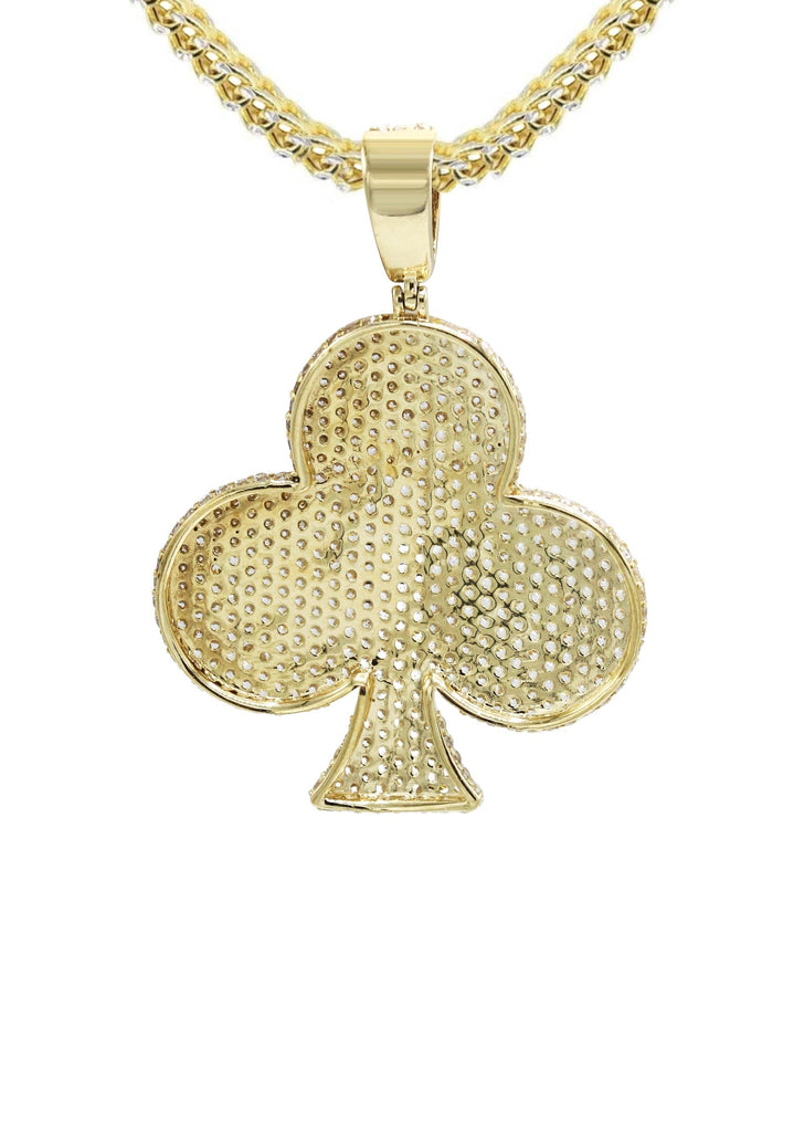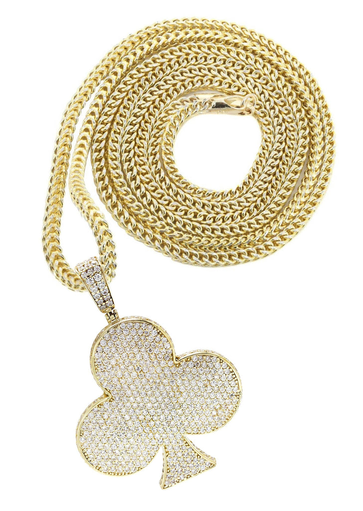 10K Gold Chain And Cz Clover Pendant With An Approximate Total Gram Weight Of 18.31. Pendant Weighs 8.31 Grams And The Chain Weighs 10 Grams. The Pendant Measurement Is 1.37 inches In Width And A Length Of 2 inches. The Width Of The Chain Is 3 Mm The Length And Type Of The Chain Can Be Adjusted.