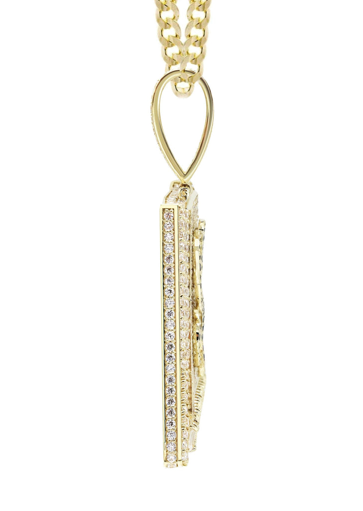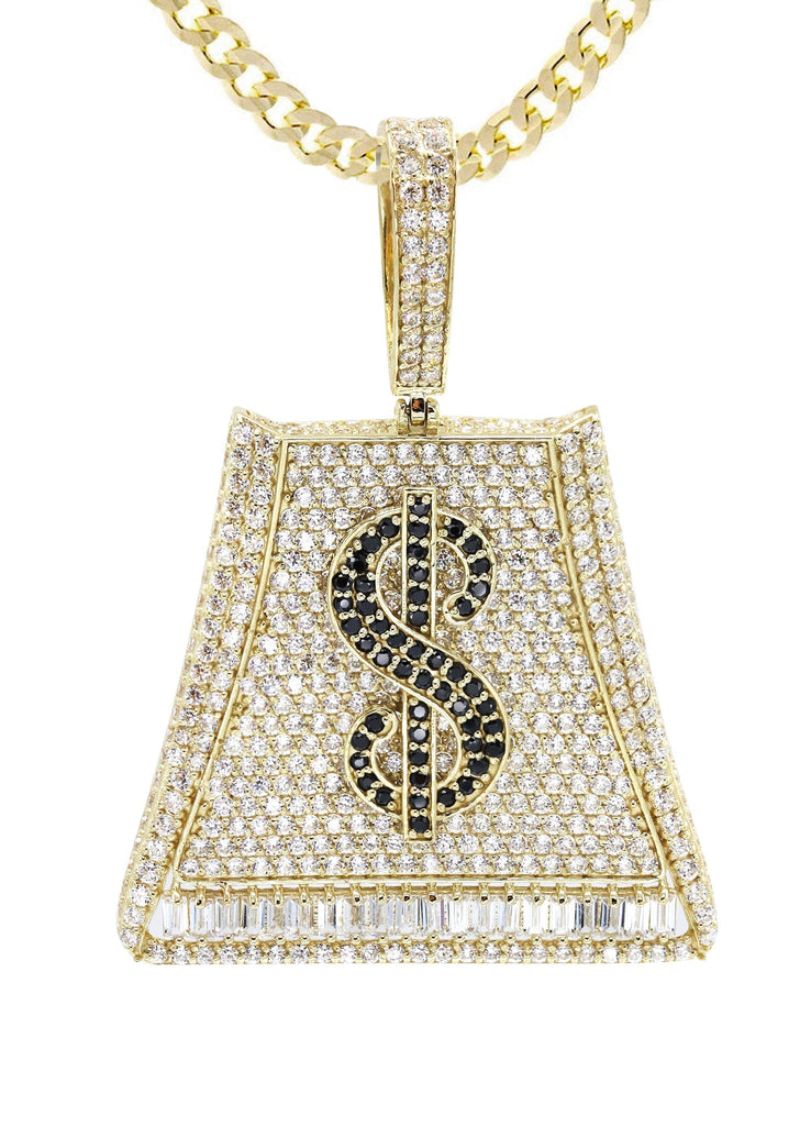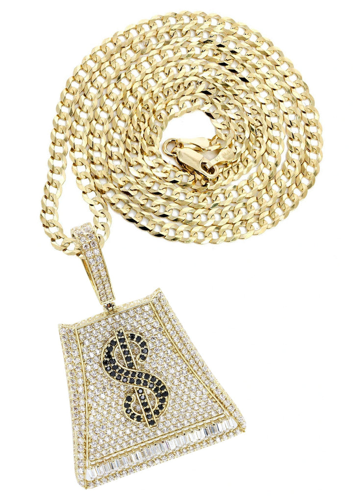 10K Gold Chain And Cz Money Bag Pendant With An Approximate Total Gram Weight Of 20. Pendant Weighs 10 Grams And The Chain Weighs 10 Grams. The Pendant Measurement Is 1.46 inches In Width And A Length Of 2 inches. The Width Of The Chain Is 3 Mm The Length And Type Of The Chain Can Be Adjusted.