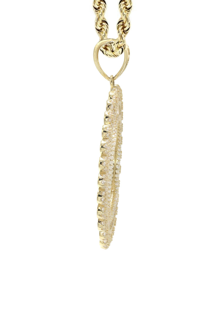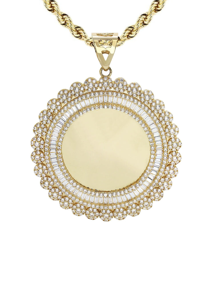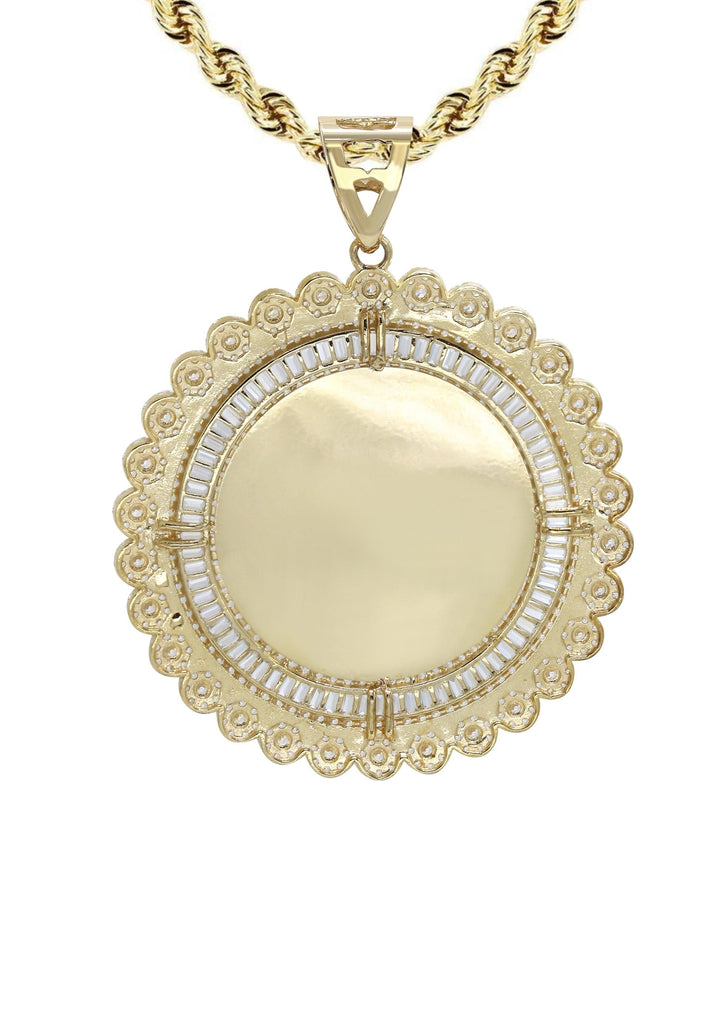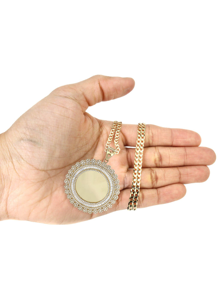 10K Gold Chain And Cz Round Picture Pendant With An Approximate Total Gram Weight Of 23.5 . Pendant Weighs 13.5 Grams And The Chain Weighs 10 Grams. The Pendant Measurement Is 2 inches In Width And A Length Of 2.5 inches. The Width Of The Chain Is 3 Mm The Length And Type Of The Chain Can Be Adjusted.