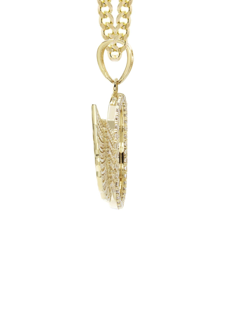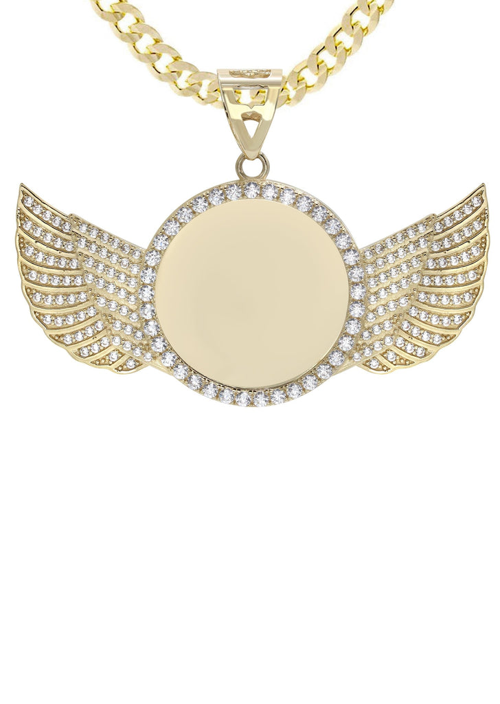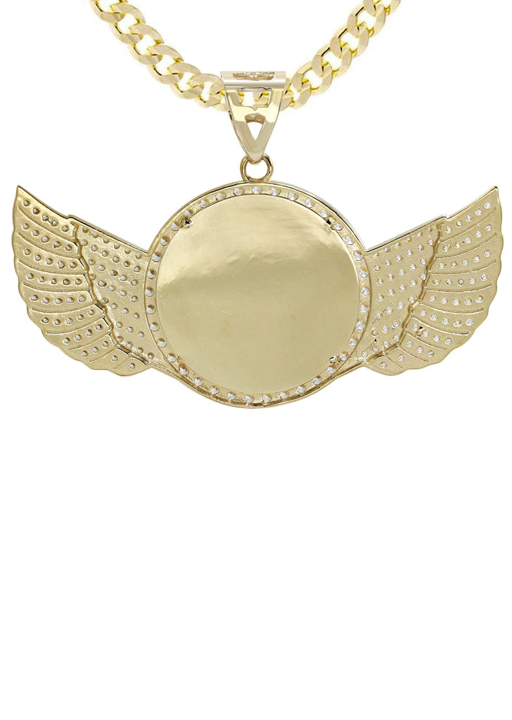 10K Gold Chain And Cz Wings Picture Pendant With An Approximate Total Gram Weight Of 19.2. Pendant Weighs 8.6 Grams And The Chain Weighs 10 Grams. The Pendant Measurement Is 2.3 inches In Width And A Length Of 1.6 inches. The Width Of The Chain Is 3 Mm The Length And Type Of The Chain Can Be Adjusted.