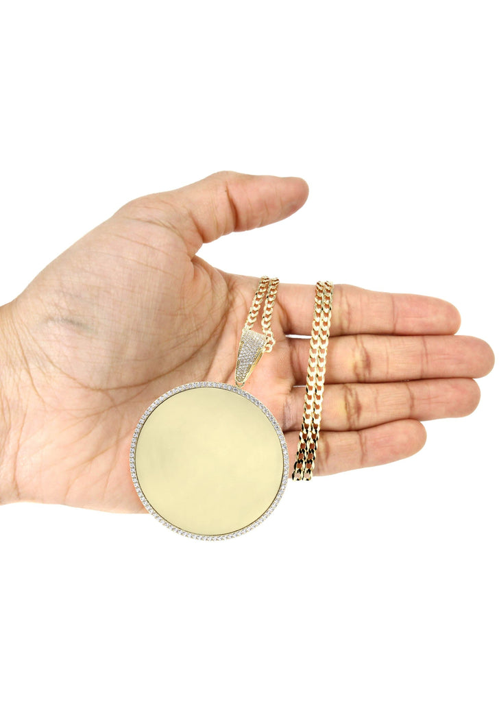 10K Gold Chain And Cz Large Picture Pendant With An Approximate Total Gram Weight Of 24.3. Pendant Weighs 14.3 Grams And The Chain Weighs 10 Grams. The Pendant Measurement Is 2.28 inches In Width And A Length Of 3 inches. The Width Of The Chain Is 3 Mm The Length And Type Of The Chain Can Be Adjusted.