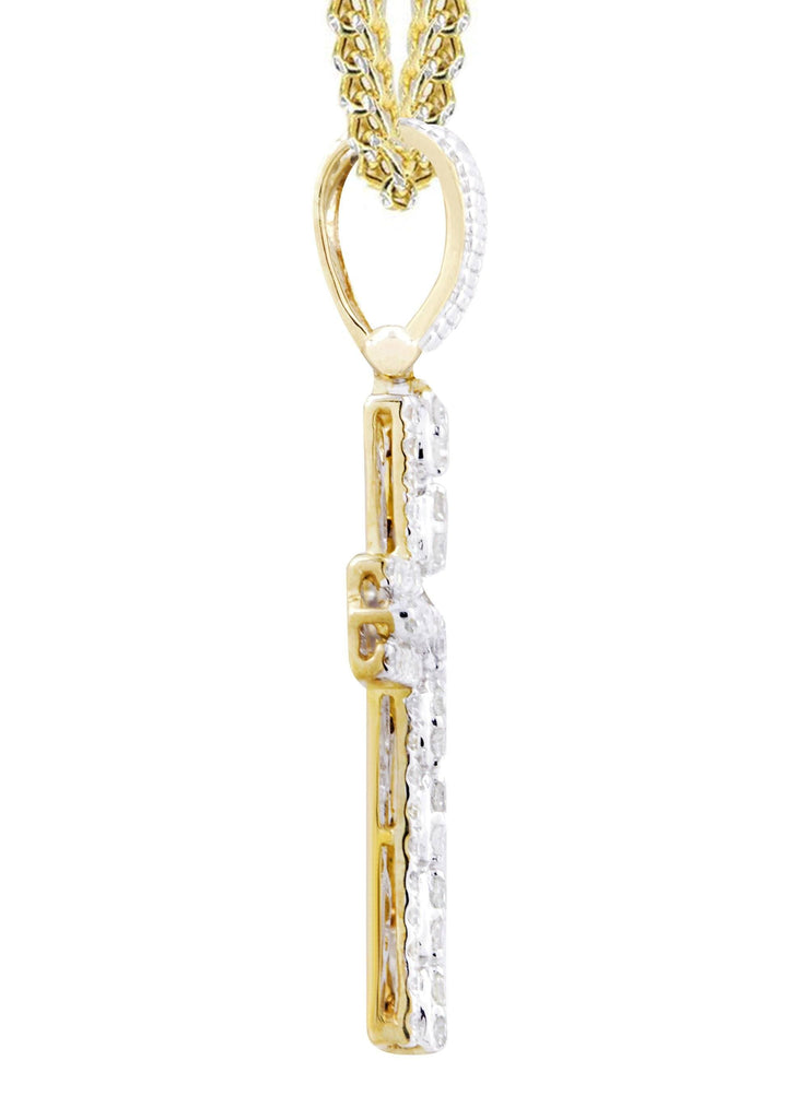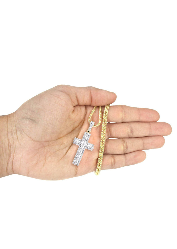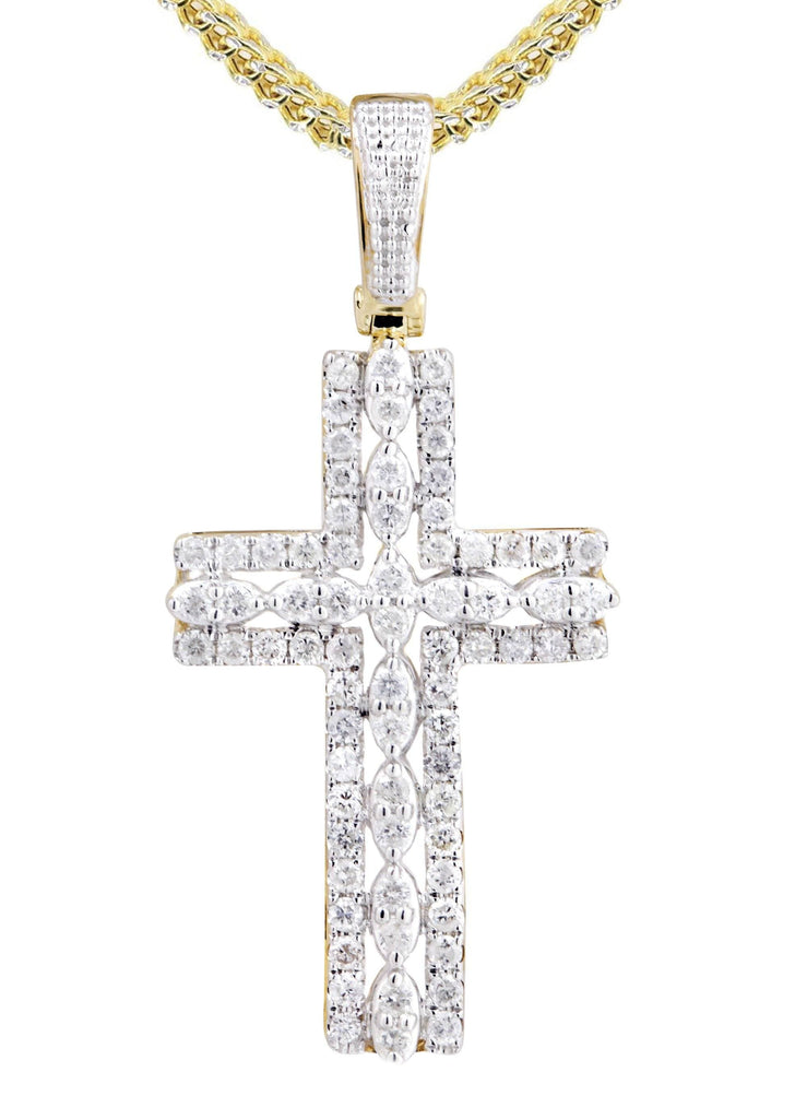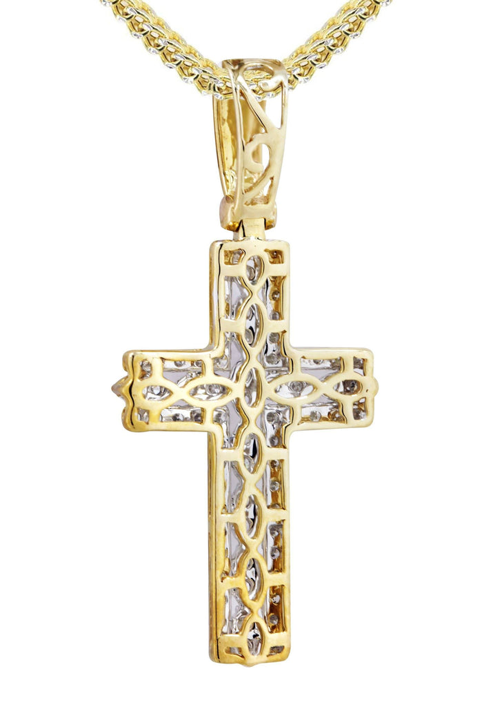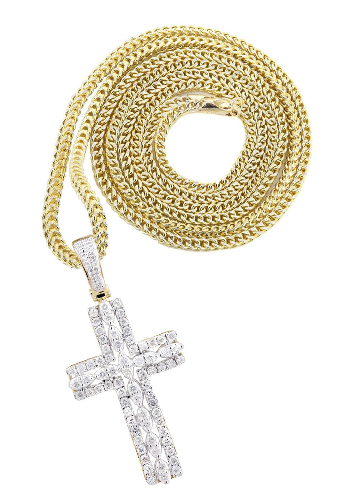 10K Yellow Gold Crucifix Pendant & Franco Chain With Approximately 1.26 Carats Of Diamonds. The Pendant Width Is 0.8 Inches And The Length Is 1.75 Inches. The Chain Options Include A 10k Gold Cuban Chain, Franco Or Rope With A Width Of 3mm's And The Length Can Be Selected To Any Preference.