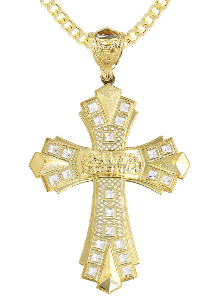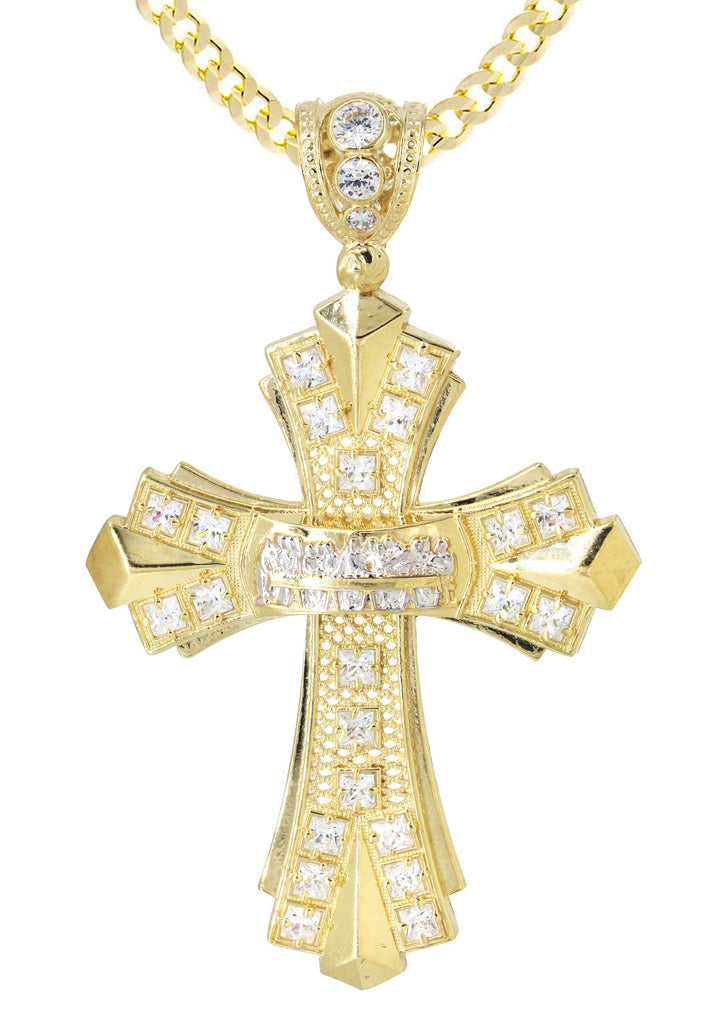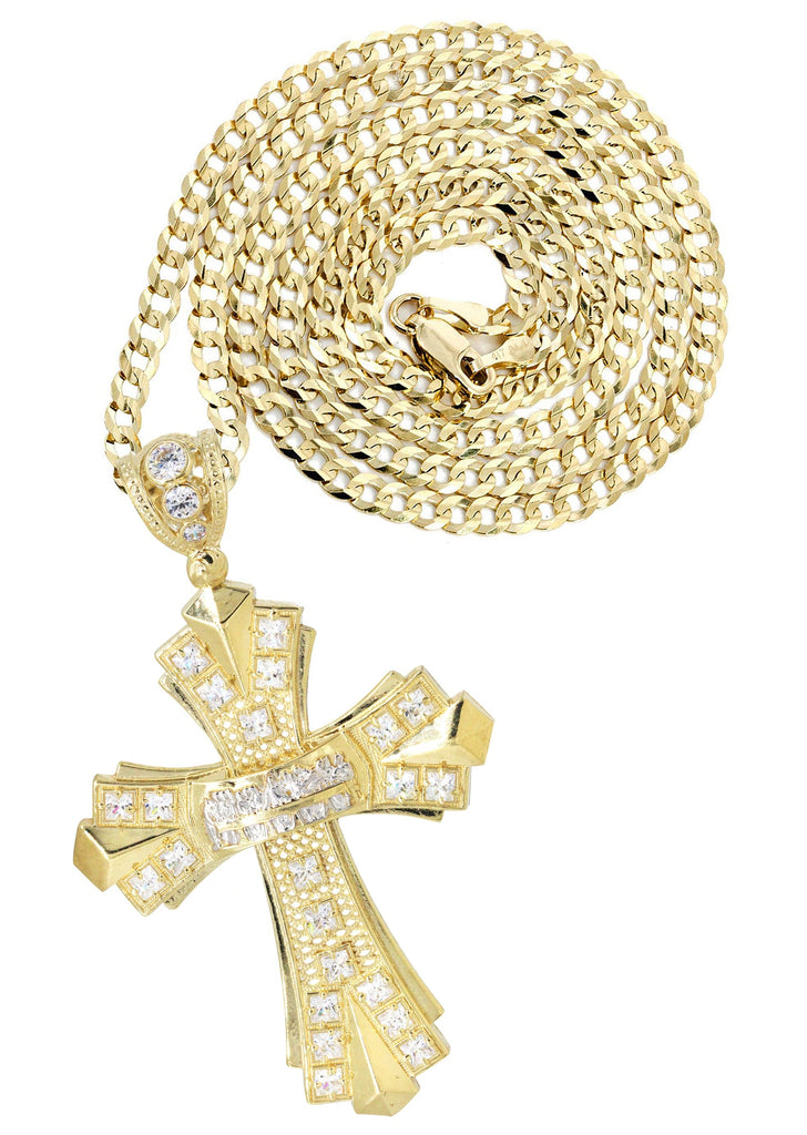 Cuban Chain And Cross Pendant With An Approximate Total Gram Weight Of 17.8. Pendant Weighs 7.8Grams And The Chain Weighs 10 Grams. The Pendant Measurement Is 1.7 Inches In Width And A Length Of 2.9 Inches. The Width Of The Chain Is 3 Mm And The Length Of The Chain Can Be Adjusted.<