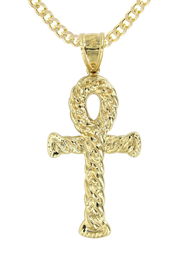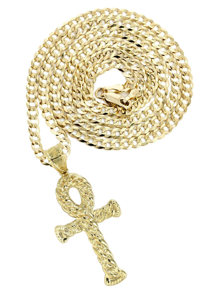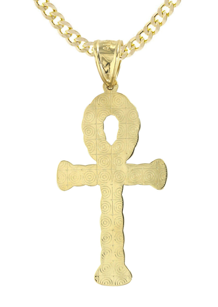 Cuban Chain And Ankh Pendant With An Approximate Total Gram Weight Of 12.6. Pendant Weighs 3.1 Grams And The Chain Weighs 10 Grams. The Pendant Measurement Is 1.1 inches In Width And A Length Of 2.5 inches. The Width Of The Chain Is 3 Mm And The Length Of The Chain Can Be Adjusted.