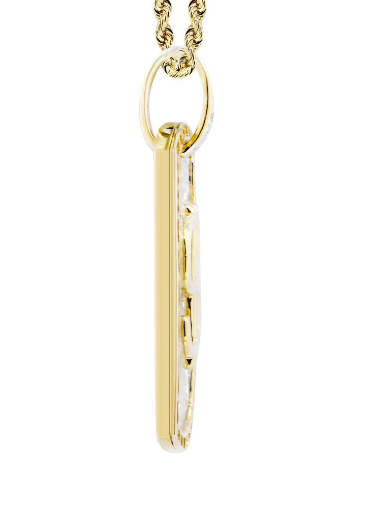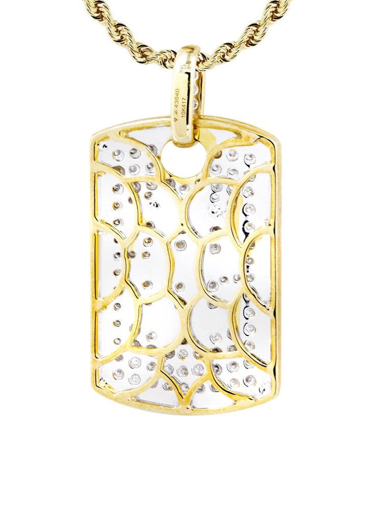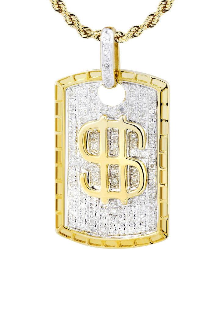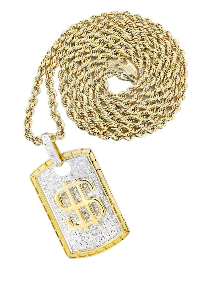 10K Yellow Gold Dog Tag Pendant & Rope Chain With Approximately 0.52 Carats Of Diamonds. The Pendant Width Is 1 Inches And The Length Is 1.5 Inches. The Chain Options Include A 10k Gold Cuban Chain, Franco Or Rope With A Width Of 3mm's And The Length Can Be Selected To Any Preference.