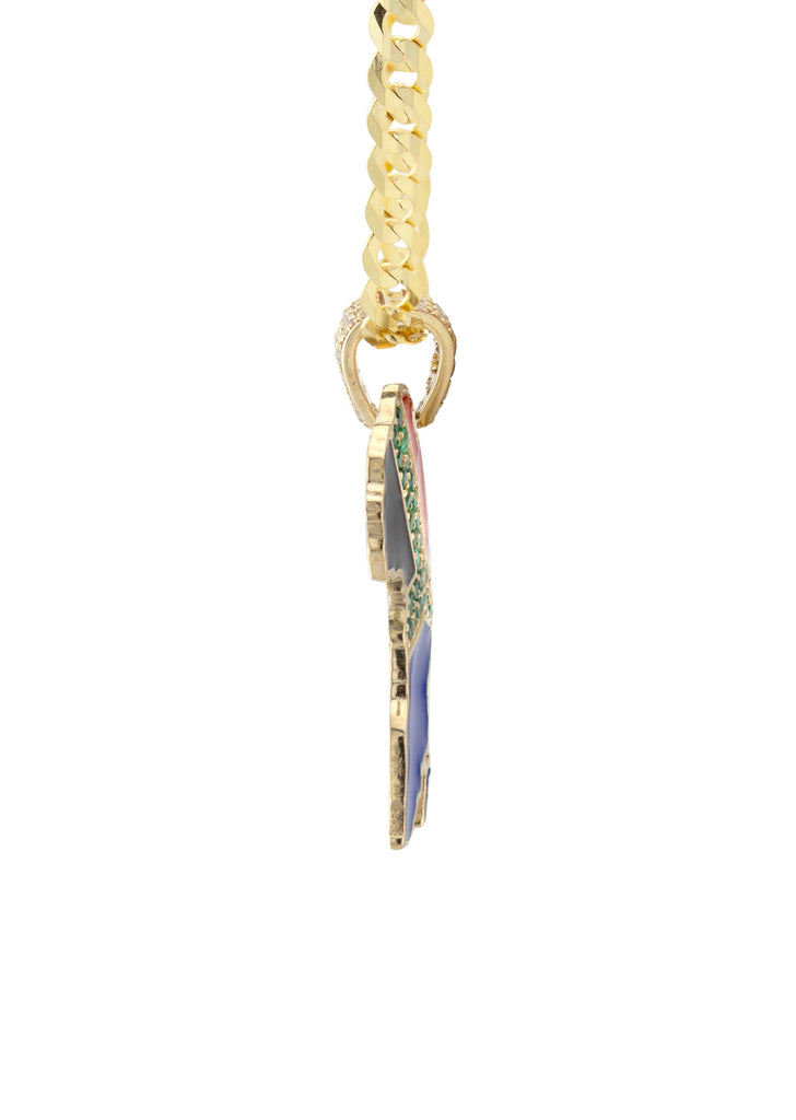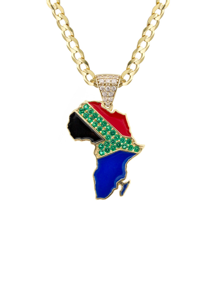 10K Yellow Gold Flag of South Africa Necklace Encrusted With Cubic Zirconia Crystals With An Approximate Total Gram Weight Of 9.2. Pendant Weighs 2.2 Grams And The Chain Weighs 7 Grams. The Pendant Measurement Is 1.1 inches In Width And A Length Of 2.2 inches. The Length And Type Of The Chain Can Be Adjusted Or Select The No Chain Option.