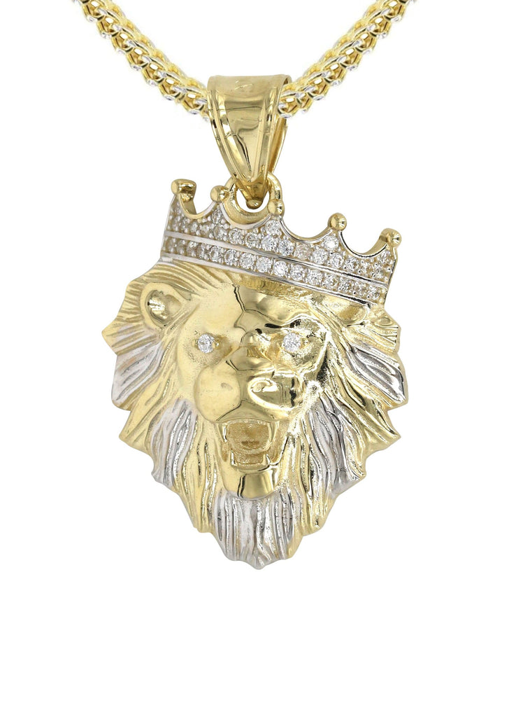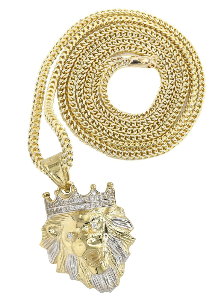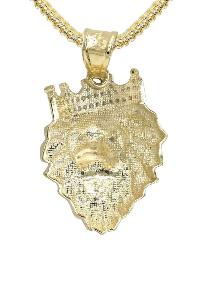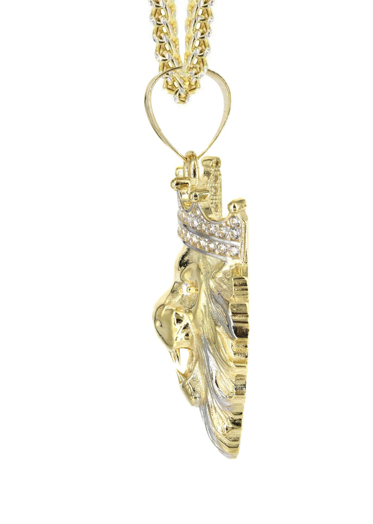 Franco Chain And Lion Pendant With An Approximate Total Gram Weight Of 17.4. Pendant Weighs 7.4 Grams And The Chain Weighs 10 Grams. The Pendant Measurement Is 1 Inches In Width And A Length Of 1.6 Inches. The Width Of The Chain Is 3 Mm And The Length Of The Chain Can Be Adjusted.