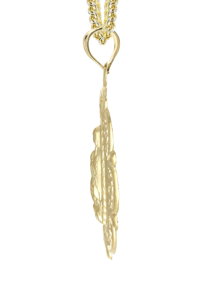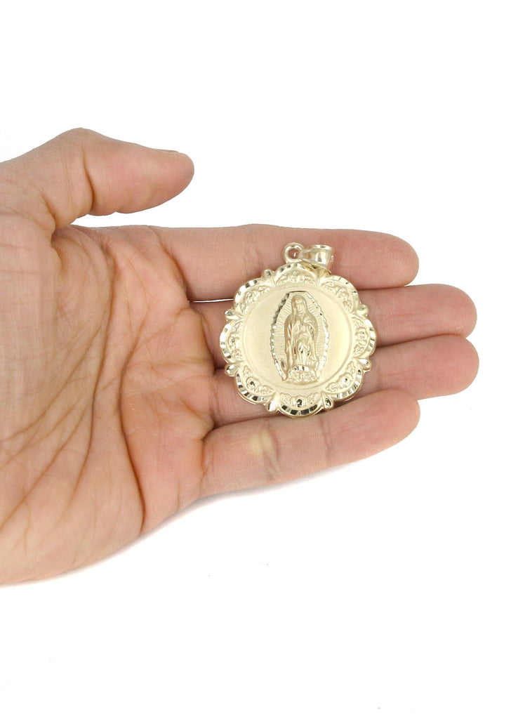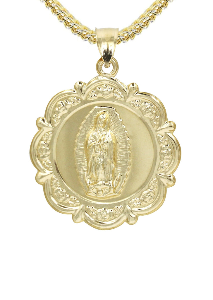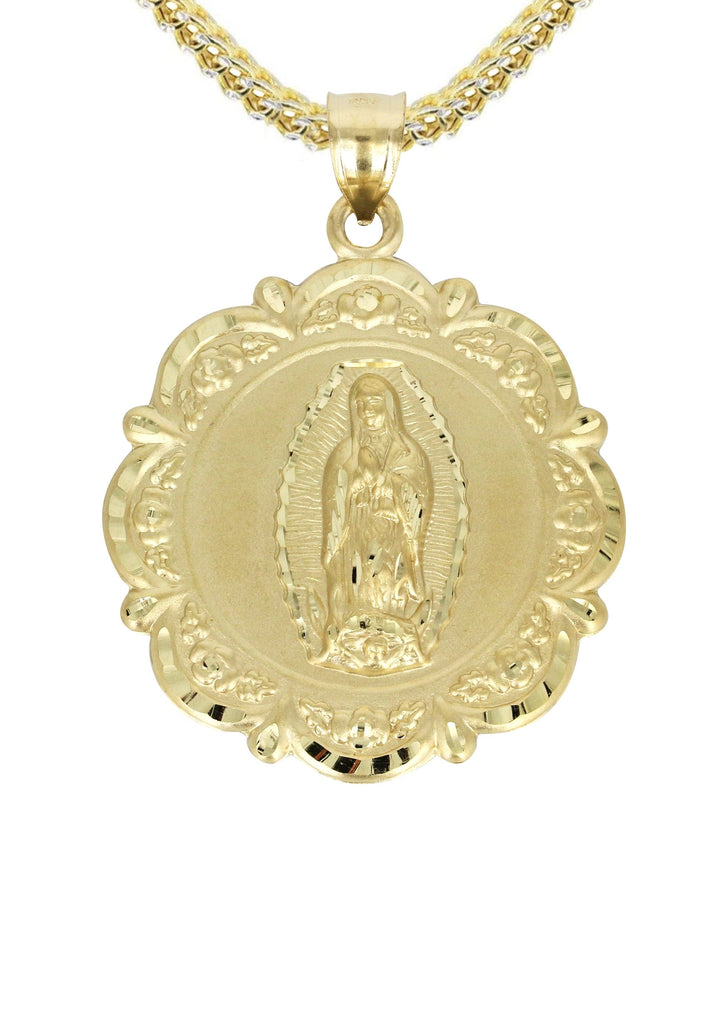Franco Chain And Virgin Mary Pendant With An Approximate Total Gram Weight Of 15.2. Pendant Weighs 5 Grams And The Chain Weighs 10 Grams. The Pendant Measurement Is 1.6 inches In Width And A Length Of 2.2 inches. The Width Of The Chain Is 3 Mm And The Length Of The Chain Can Be Adjusted.