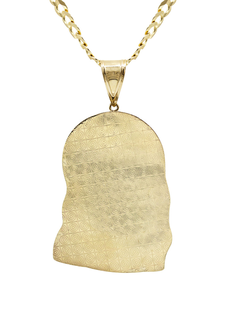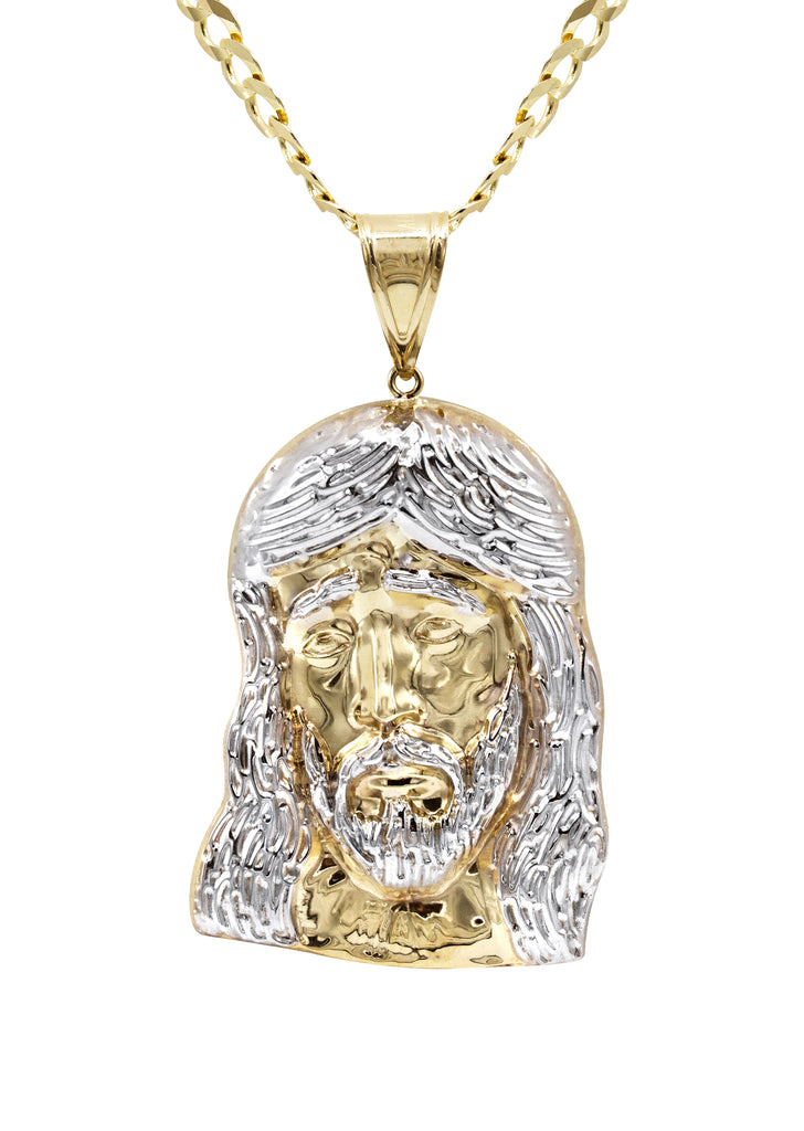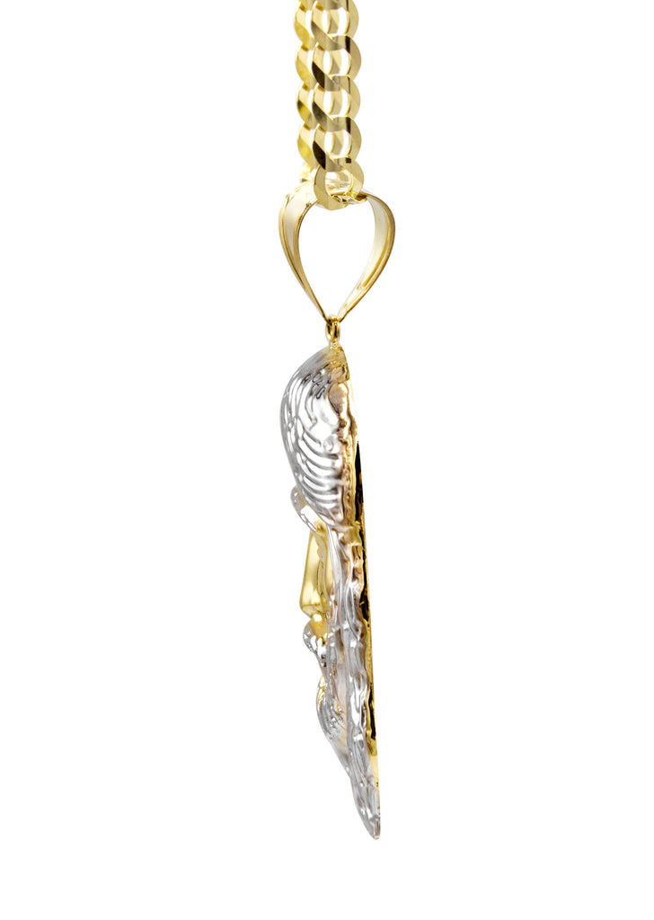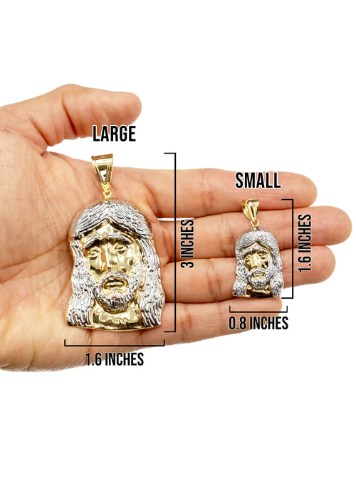 Gold Jesus Piece Necklace which comes in small and large sizes. Small size is 0.8 by 1.6 inches and the large pendant is 1.6 by 3 inches. You can select any chain you want to customize your setup. The weight of the necklace will adjust once you select your final options.
