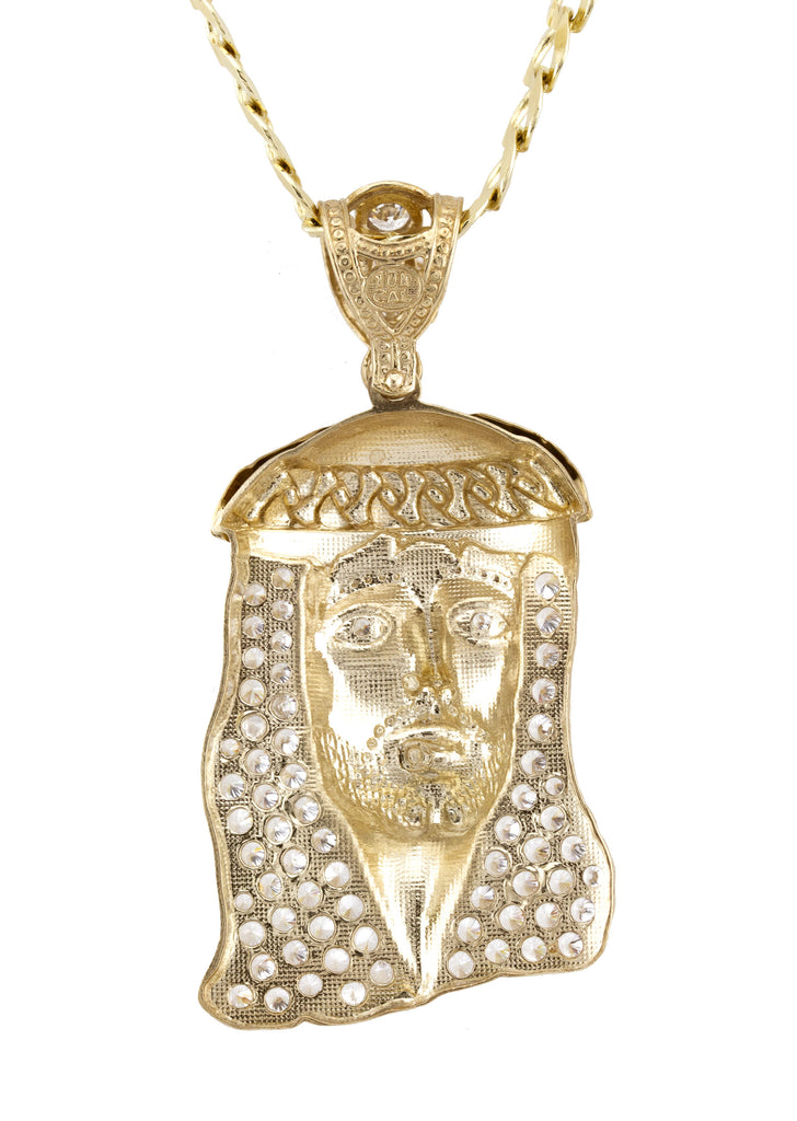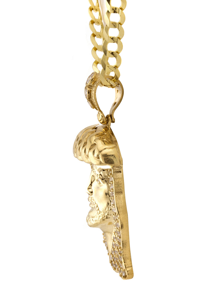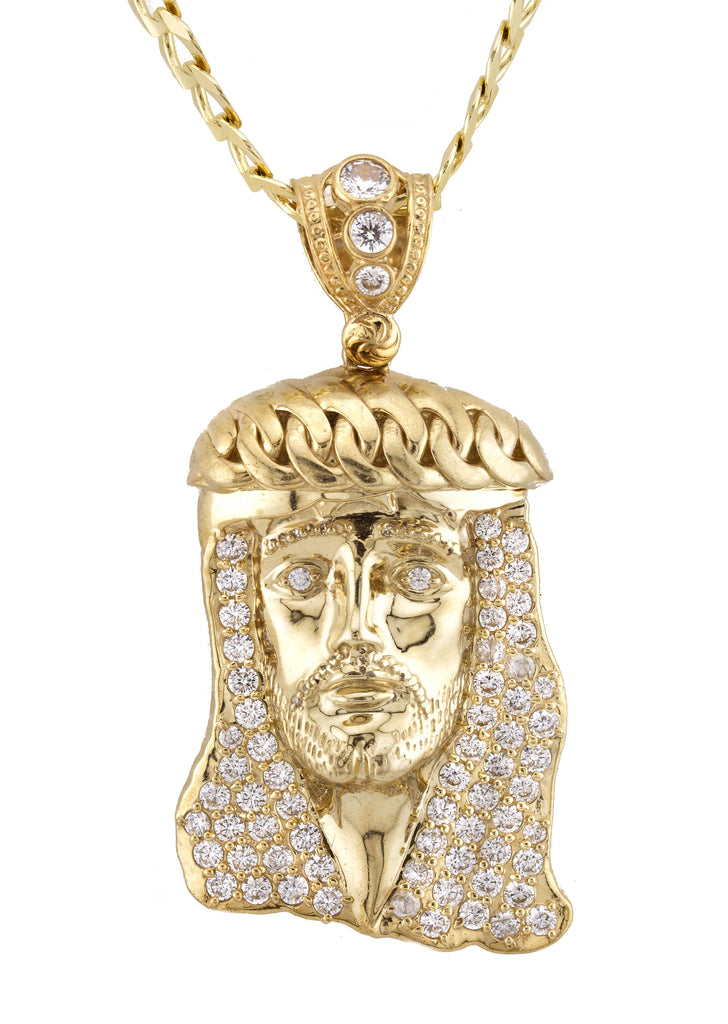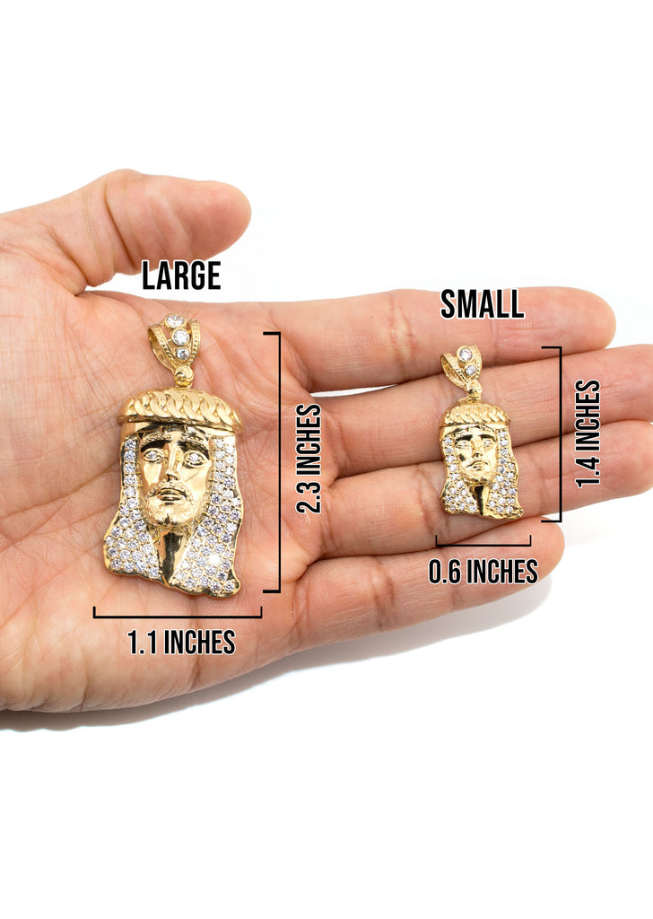 Gold Jesus Piece Necklace which comes in small and large sizes. Small size is 0.6 by 1.4 inches and the large pendant is 1.1 by 2.3 inches. You can select any chain you want to customize your setup. The weight of the necklace will adjust once you select your final options.