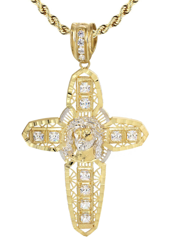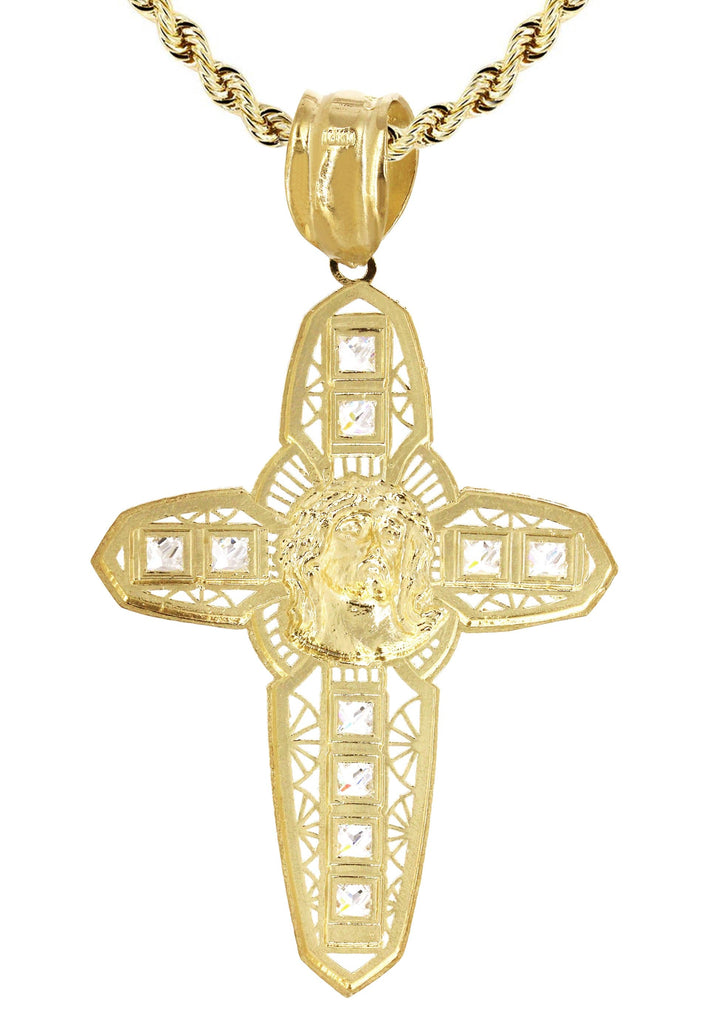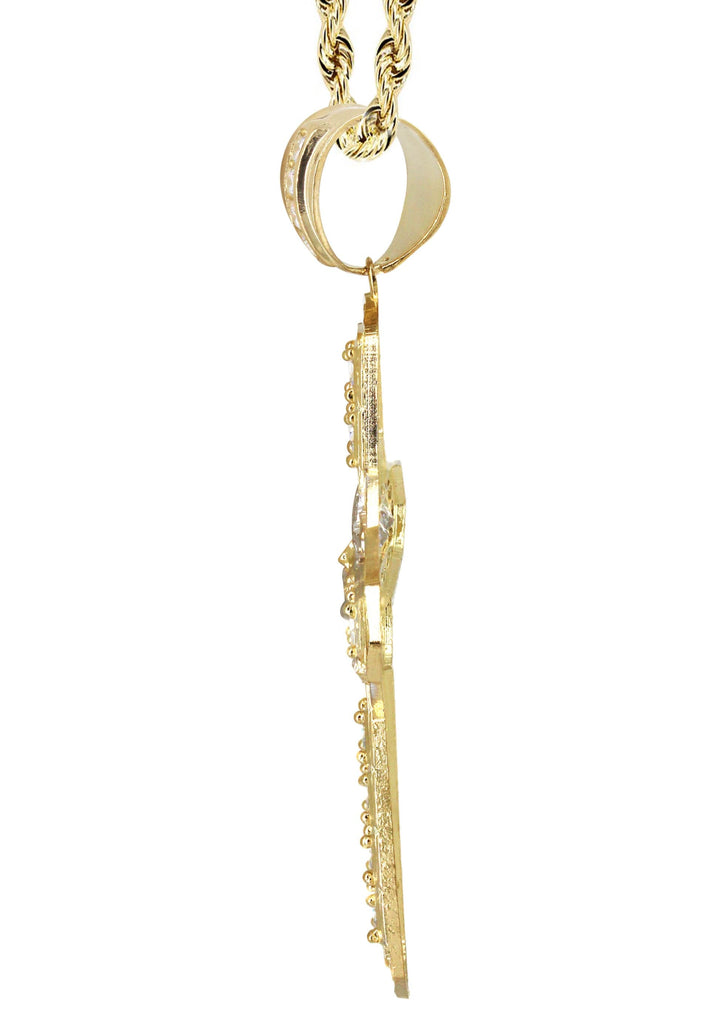 Rope Chain And Crucifix Pendant With An Approximate Total Gram Weight Of 24.7. Pendant Weighs 14.7 Grams And The Chain Weighs 10 Grams. The Pendant Measurement Is 2.1 Inches In Width And A Length Of 3.9 Inches. The Width Of The Chain Is 3 Mm And The Length Of The Chain Can Be Adjusted.