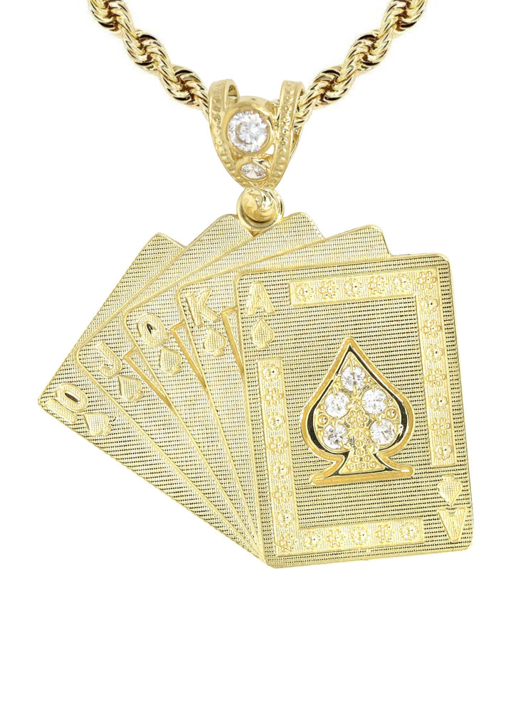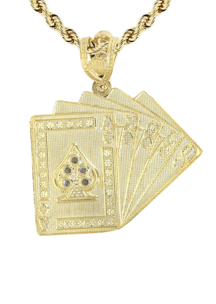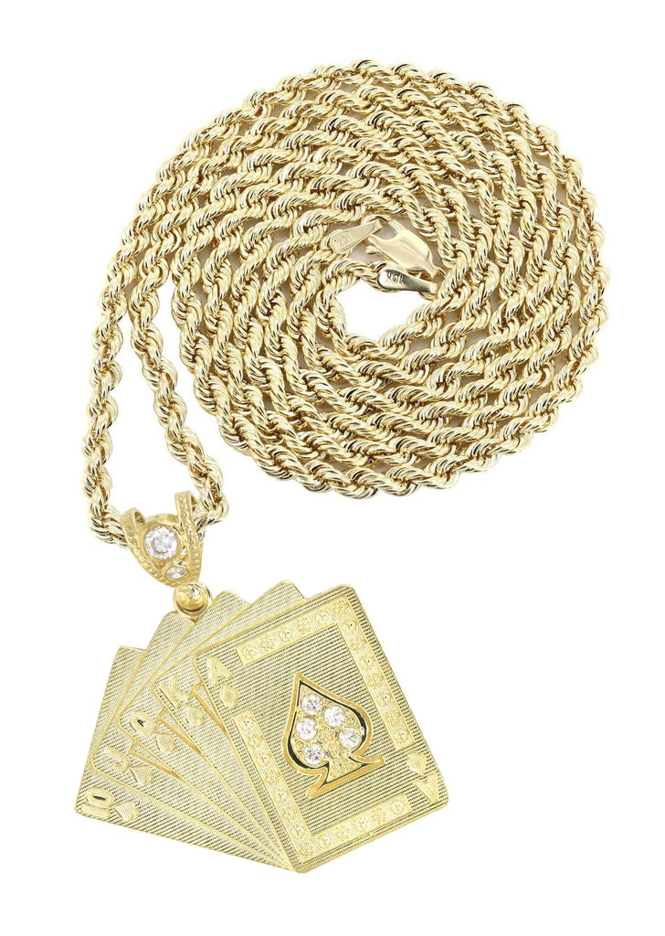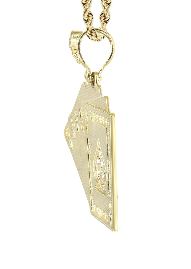 Rope Chain And Playing Cards Pendant With An Approximate Total Gram Weight Of 17.3. Pendant Weighs 7.3 Grams And The Chain Weighs 10 Grams. The Pendant Measurement Is 1.5 inches In Width And A Length Of 1.7 inches. The Width Of The Chain Is 3 Mm And The Length Of The Chain Can Be Adjusted.