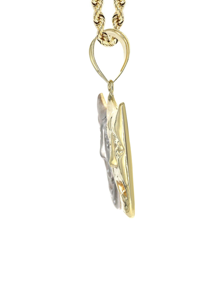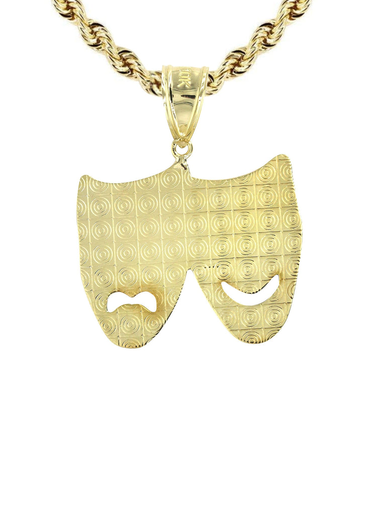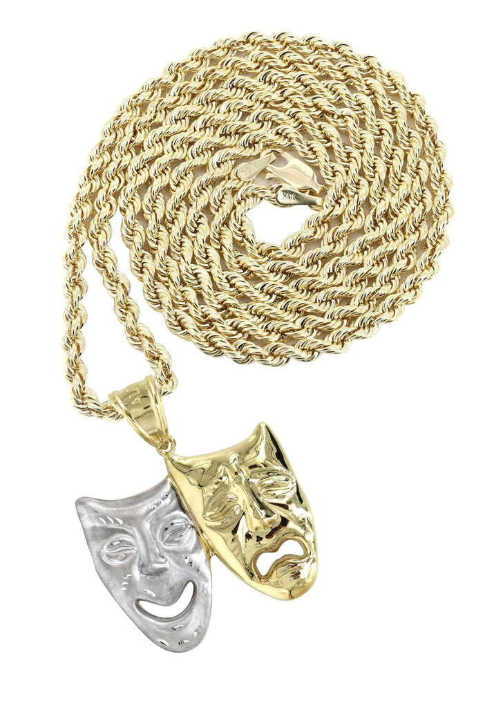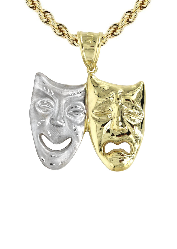 Rope Chain And Comedy & tragedy Masks Pendant With An Approximate Total Gram Weight Of 15.1. Pendant Weighs 5.1 Grams And The Chain Weighs 10 Grams. The Pendant Measurement Is 1.4 inches In Width And A Length Of 1.8 inches. The Width Of The Chain Is 3 Mm And The Length Of The Chain Can Be Adjusted.