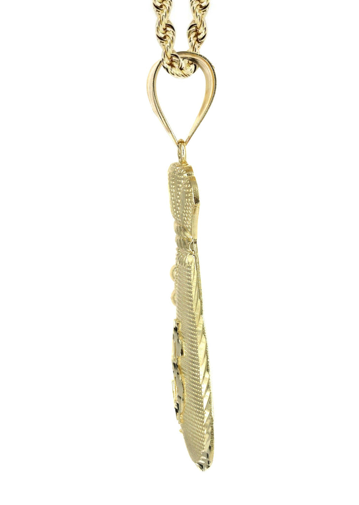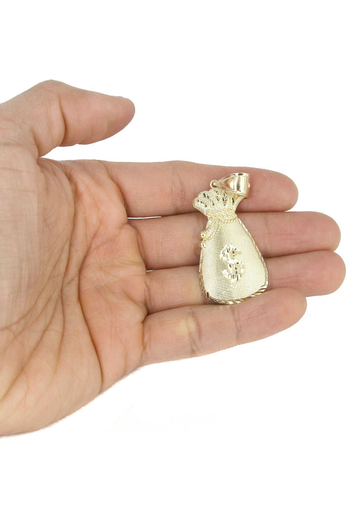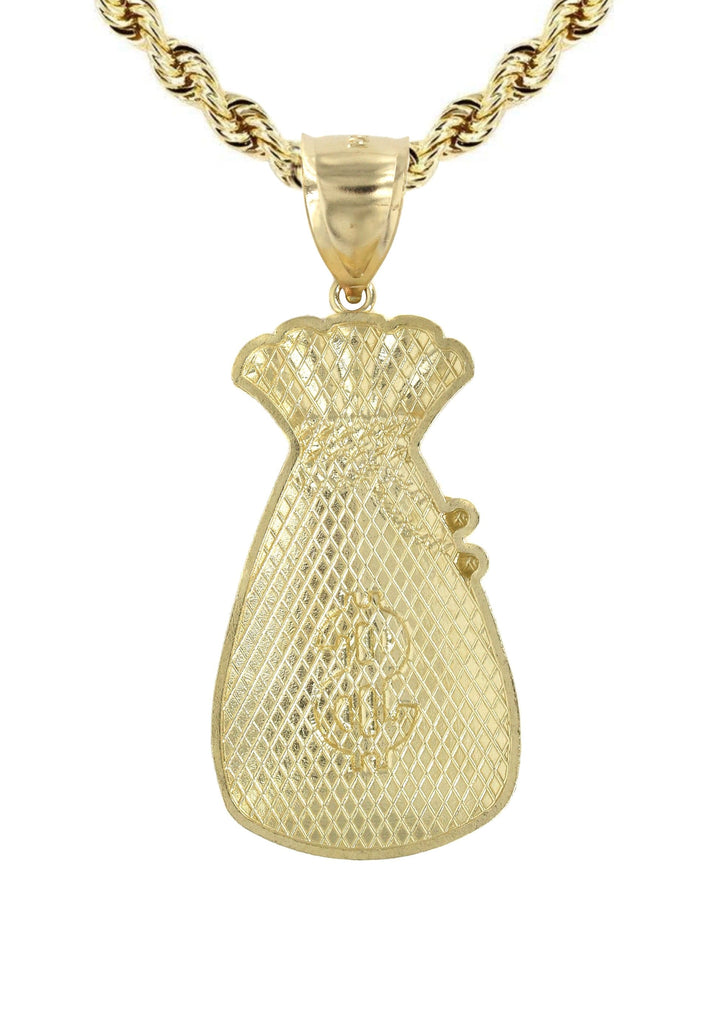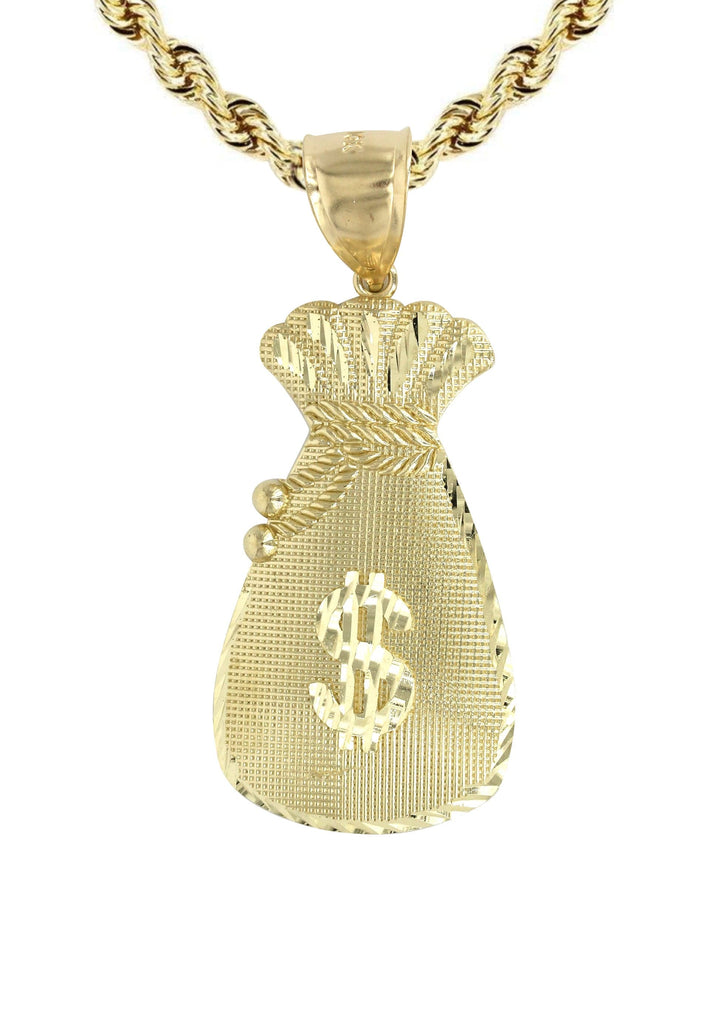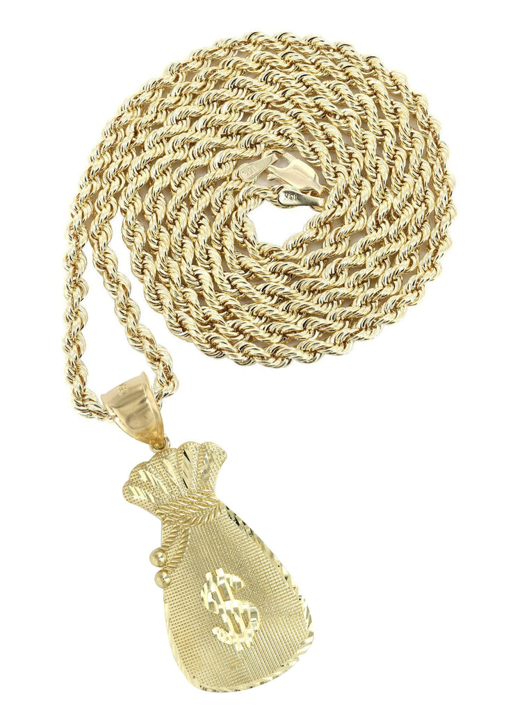 Franco Chain And Money Bag Pendant With An Approximate Total Gram Weight Of 16.4. Pendant Weighs 6.4 Grams And The Chain Weighs 10 Grams. The Pendant Measurement Is 0.9 inches In Width And A Length Of 2.2 inches. The Width Of The Chain Is 3 Mm And The Length Of The Chain Can Be Adjusted.<