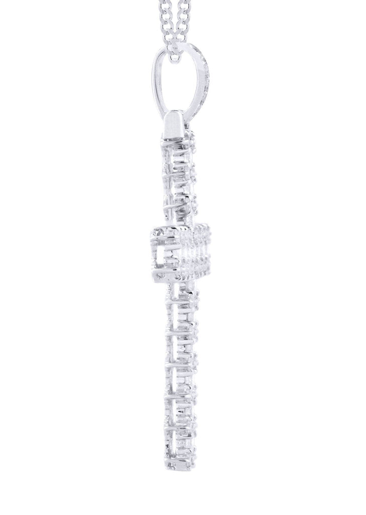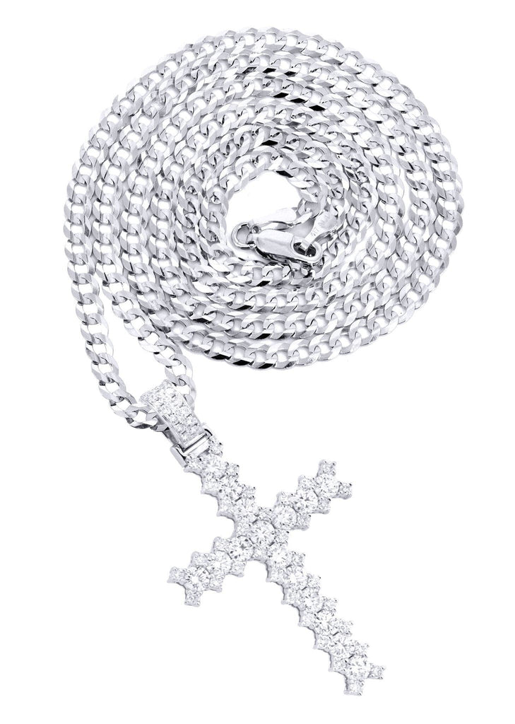 14K White Gold Cross Diamond Pendant & Cuban Chain which comes in  1.6 Inches in length and  0.8 Inches in width.  The pendant has  1.86 Carats of Vs quality diamonds.  The chain options include a 10k gold cuban chain, franco or rope with a width of 3mm's and the length can be selected to any preference.