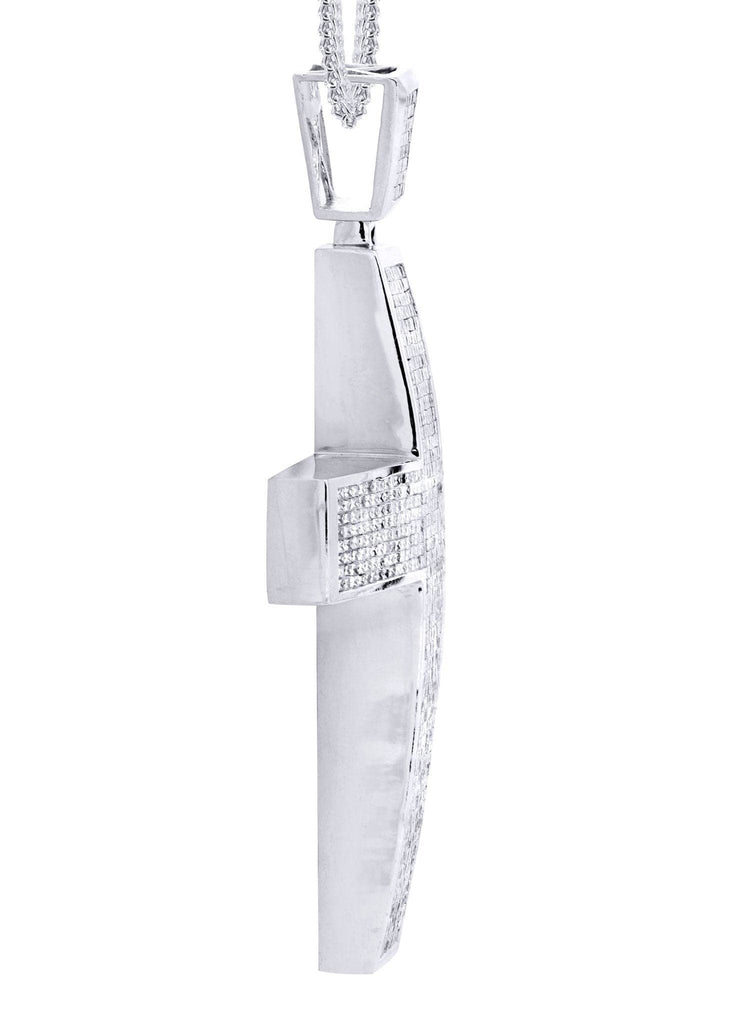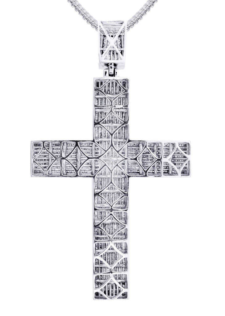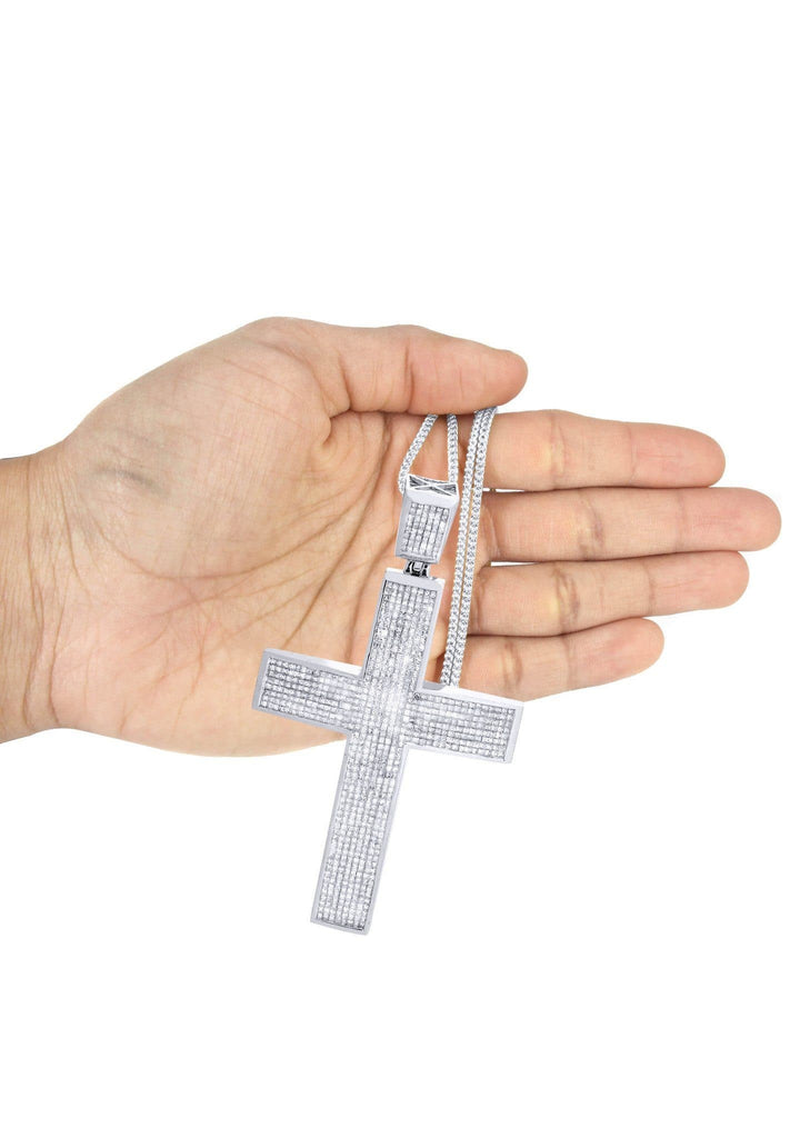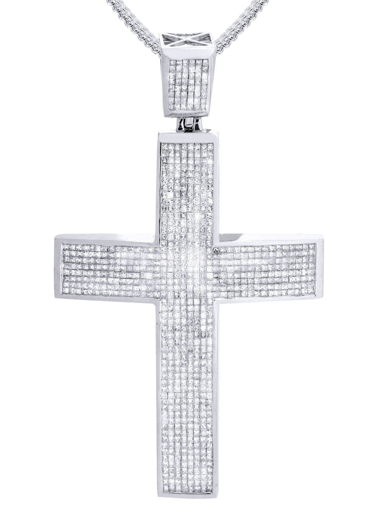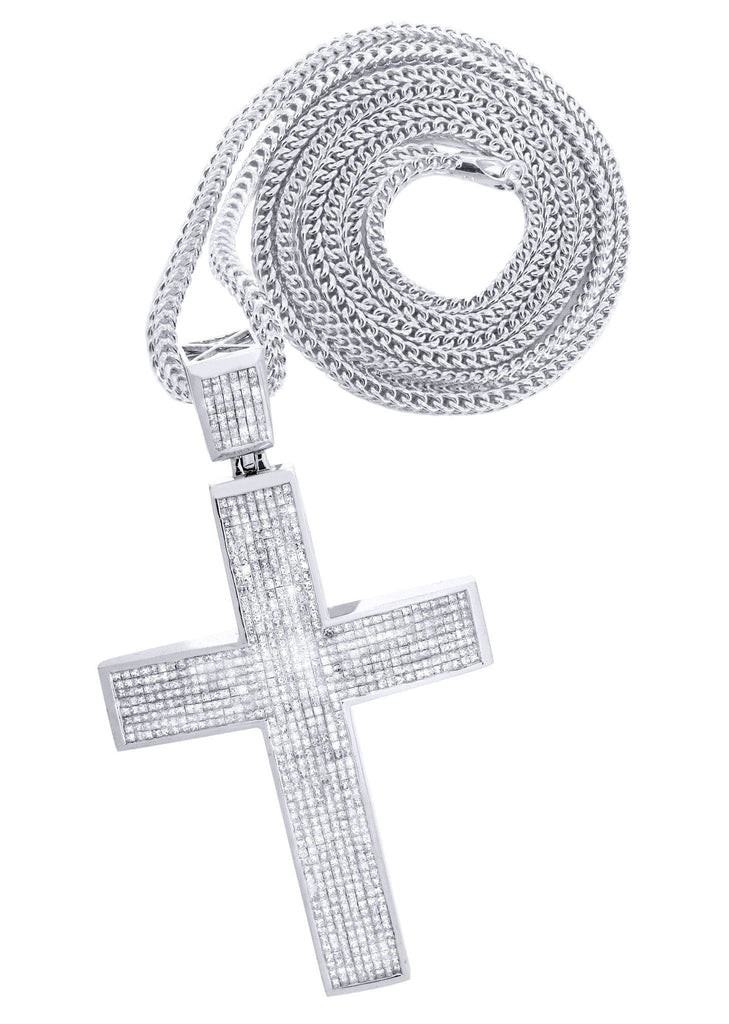 14 White Gold Cross Diamond Pendant Franco Chain which comes in  4 Inches in length and  2.25 Inches in width.  The pendant has  18.92 Carats of Vs quality diamonds.  The chain options include a 10k gold cuban chain, franco or rope with a width of 3mm's and the length can be selected to any preference.  100% REAL GOLD