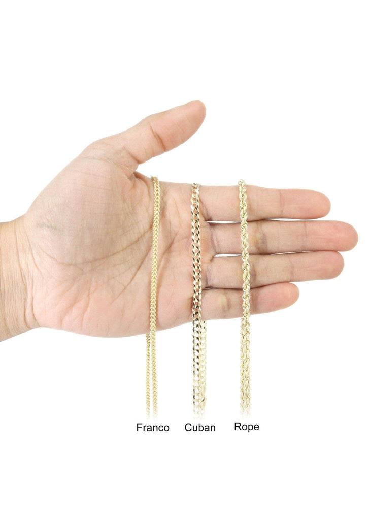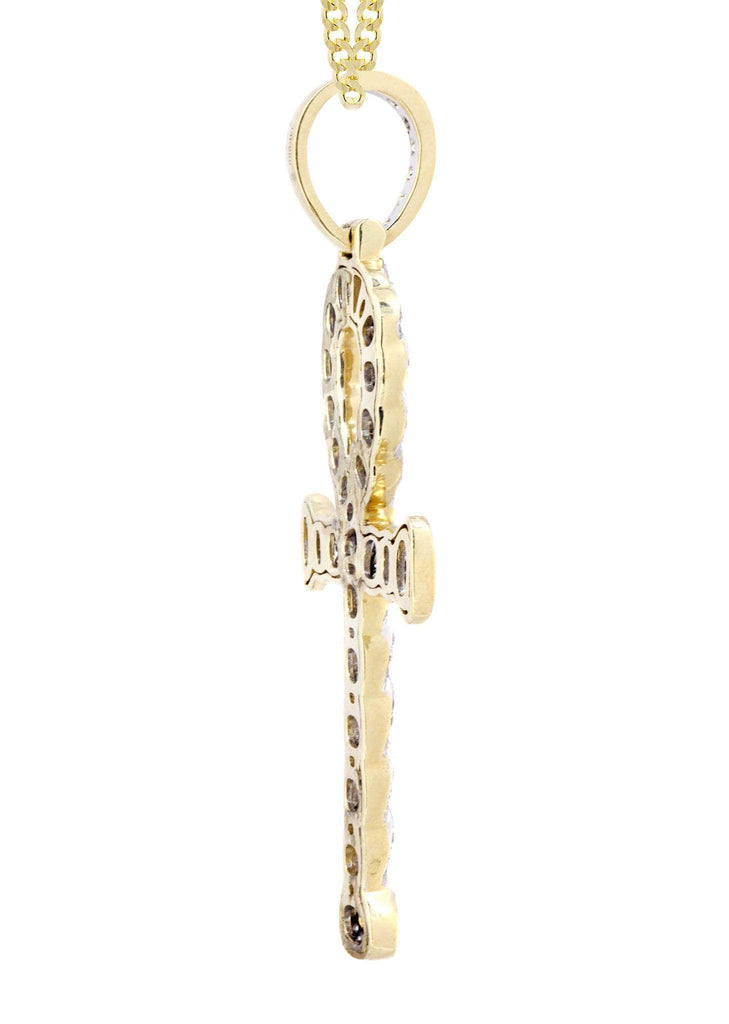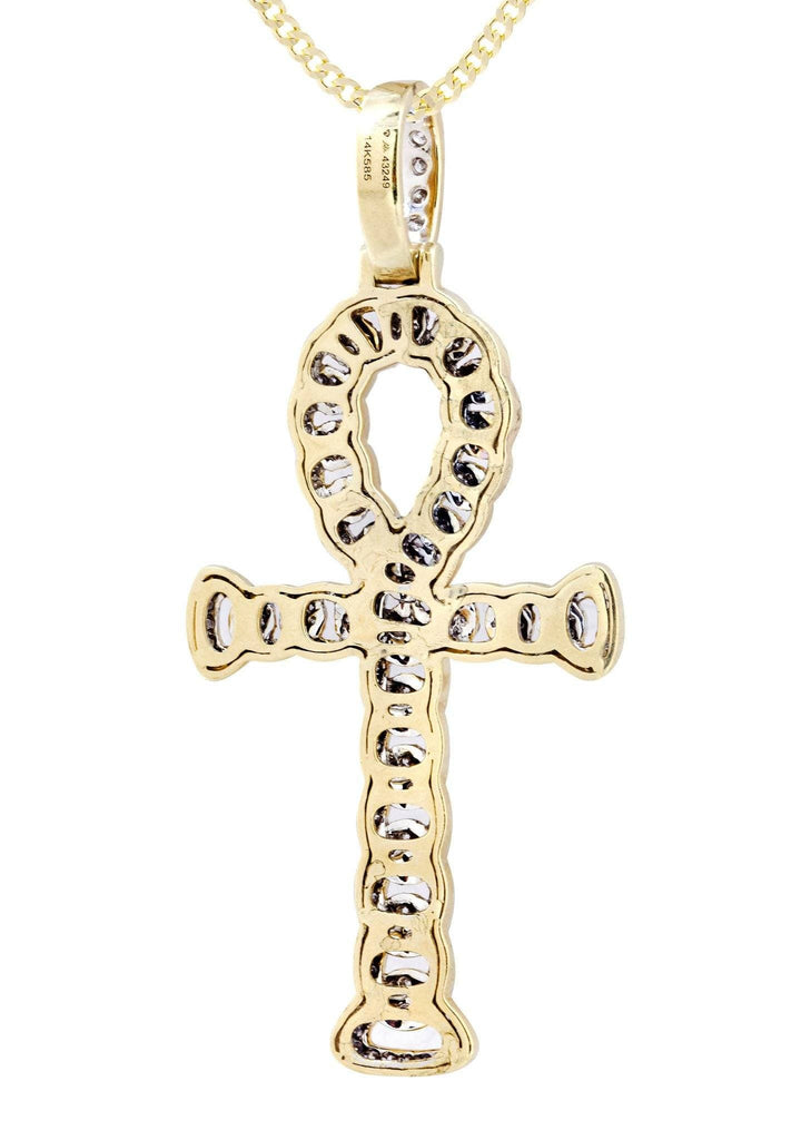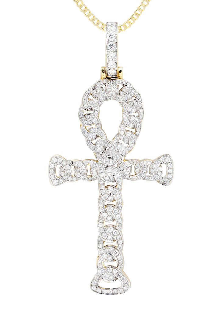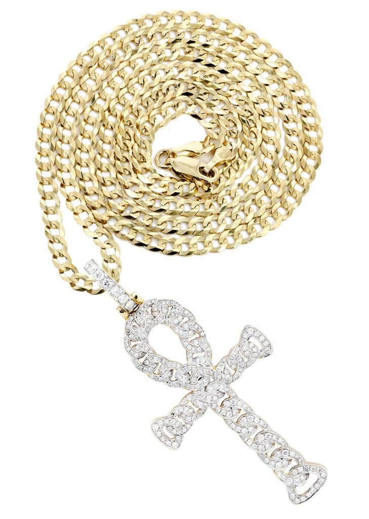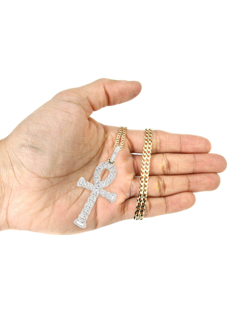 | 14K Yellow Gold Ankh Diamond Pendant & Cuban Chain which comes in 3 Inches in length and 1.5 Inches in width. The pendant has 1.88 Carats of Vs quality diamonds. The chain options include a 10k gold cuban chain, franco or rope with a width of 3mm's and the length can be selected to any preference. |
