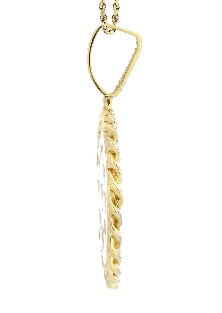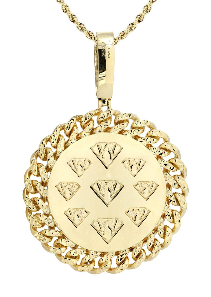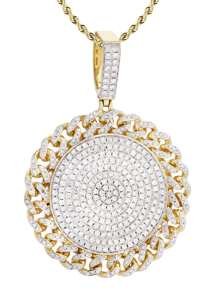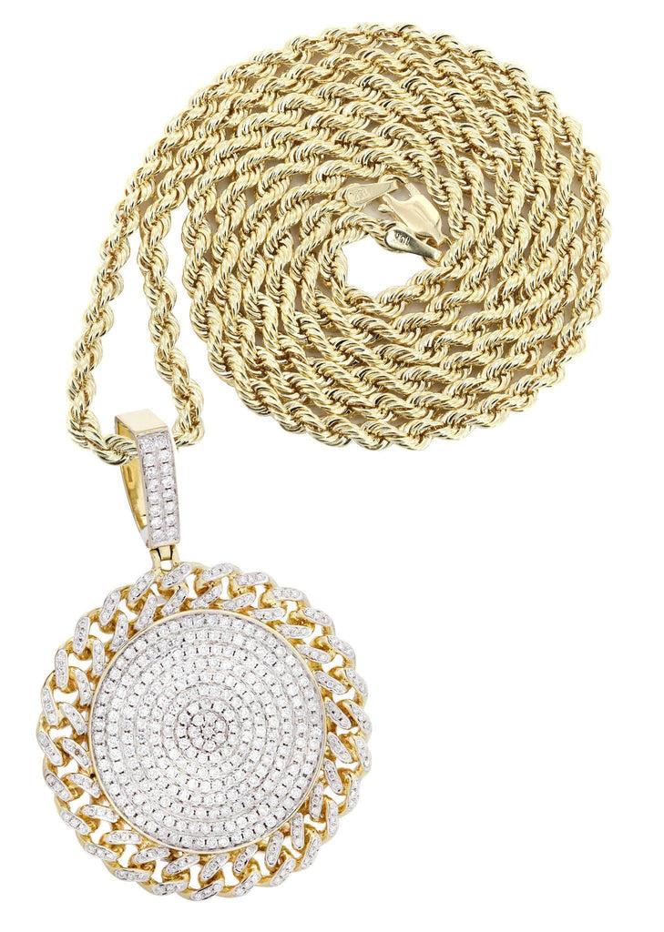 | 14K Yellow Gold Circle Pendant Diamond Pendant & Rope Chain which comes in 2.5 Inches in length and 1.75 Inches in width. The pendant has 4.17 Carats of Vs quality diamonds. The chain options include a 10k gold cuban chain, franco or rope with a width of 3mm's and the length can be selected to any preference. |