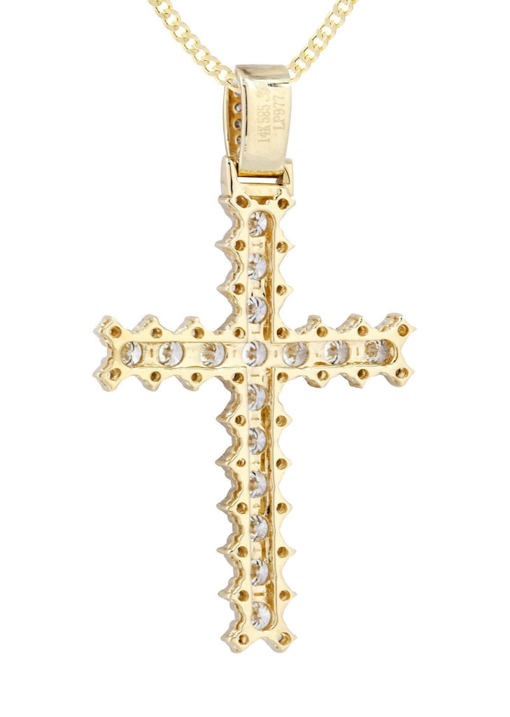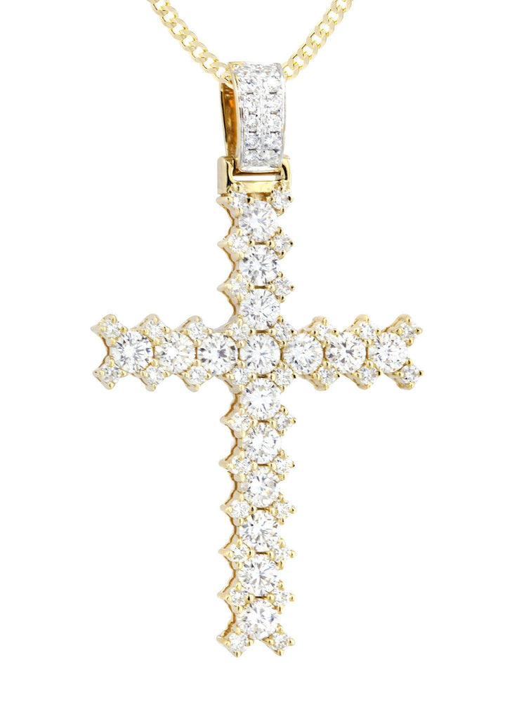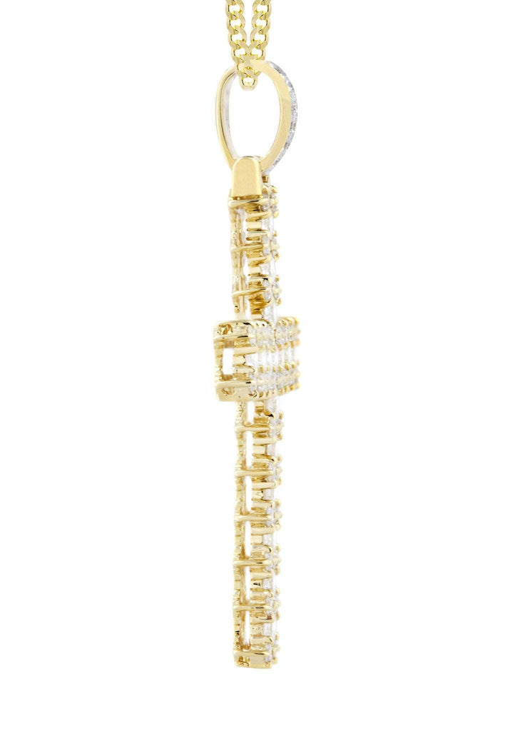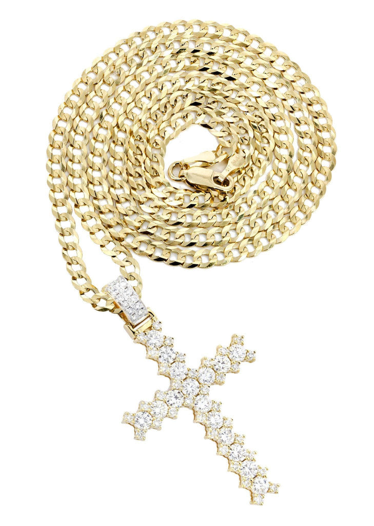 | 14K Yellow Gold Cross Diamond Pendant & Cuban Chain which comes in 1.6 Inches in length and 0.8 Inches in width. The pendant has 1.95 Carats of Vs quality diamonds. The chain options include a 10k gold cuban chain, franco or rope with a width of 3mm's and the length can be selected to any preference. |