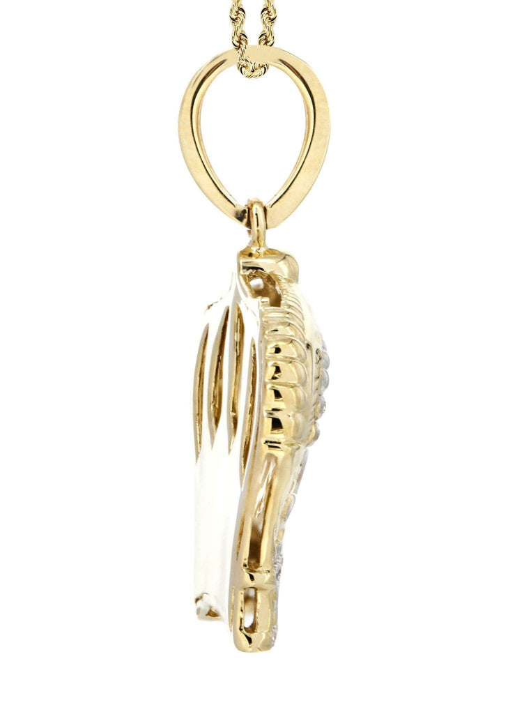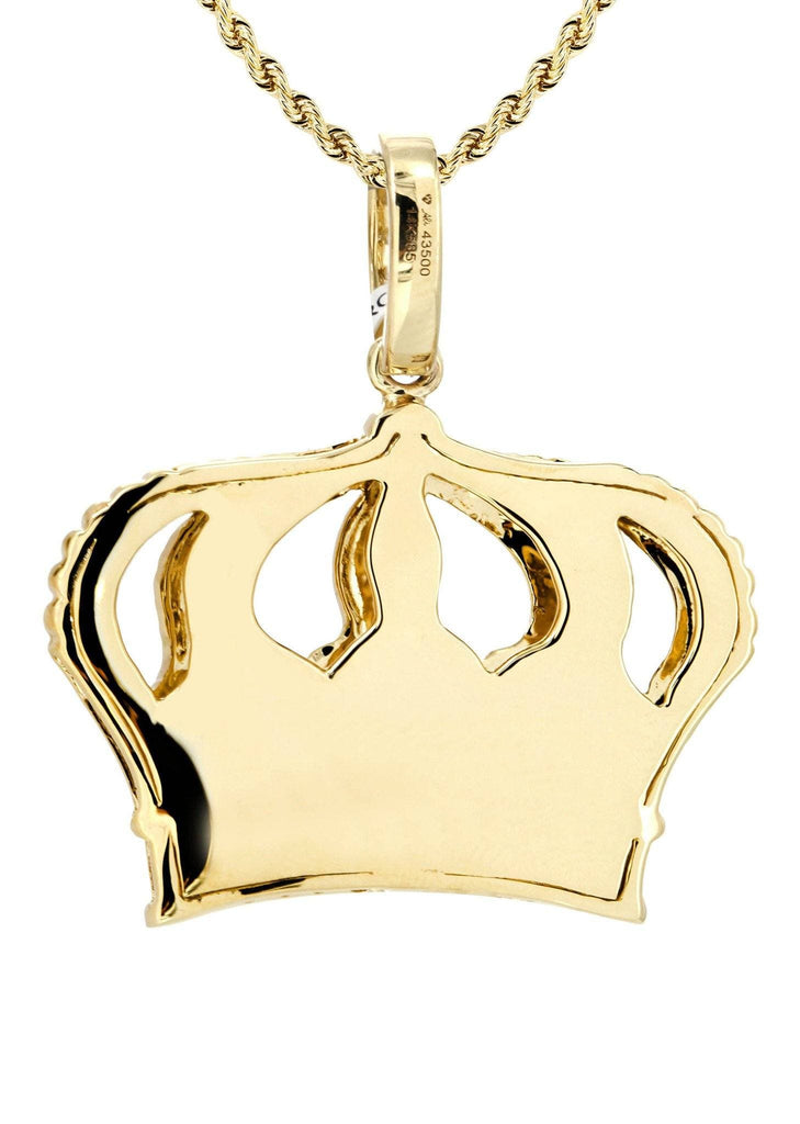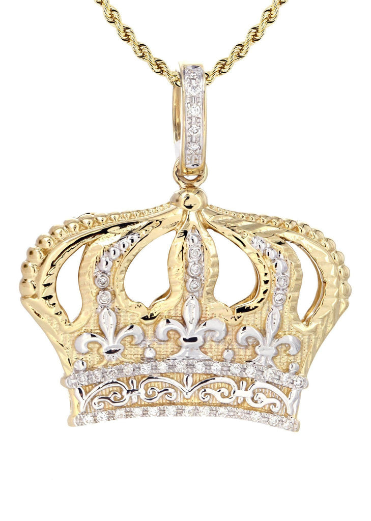 14K Yellow Gold Crown Diamond Pendant & Rope Chain which comes in  1.3 Inches in length and  1.2 Inches in width.  The pendant has  0.16 Carats of Vs quality diamonds.  The chain options include a 10k gold cuban chain, franco or rope with a width of 3mm's and the length can be selected to any preference.