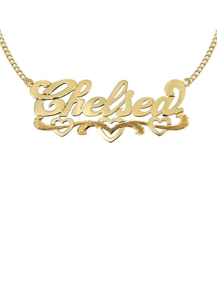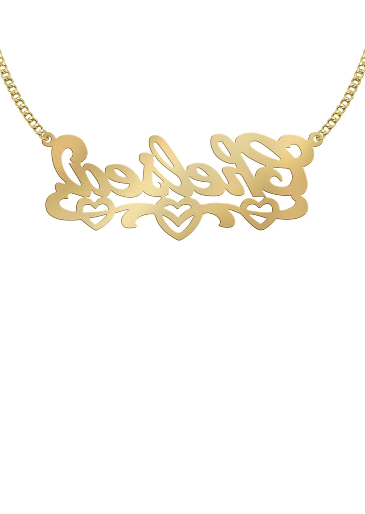 14K Ladies Diamond Cut Heart Name Plate Necklace. The length of the pendant is 0.6 inches and the width is 1.8 inches. The name plate comes with a cuban chain which can be selected to any length above. Due to the custom nature of this product, please allow 10-14 business days for completion.