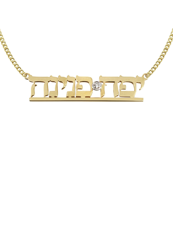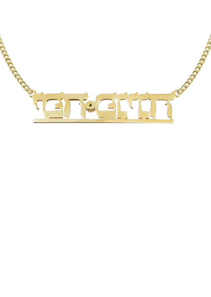 14K Ladies Hebrew Text Name Plate Necklace. The length of the pendant is 0.3 inches and the width is 1.6 inches. The name plate comes with a cuban chain which can be selected to any length above. Due to the custom nature of this product, please allow 10-14 business days for completion.