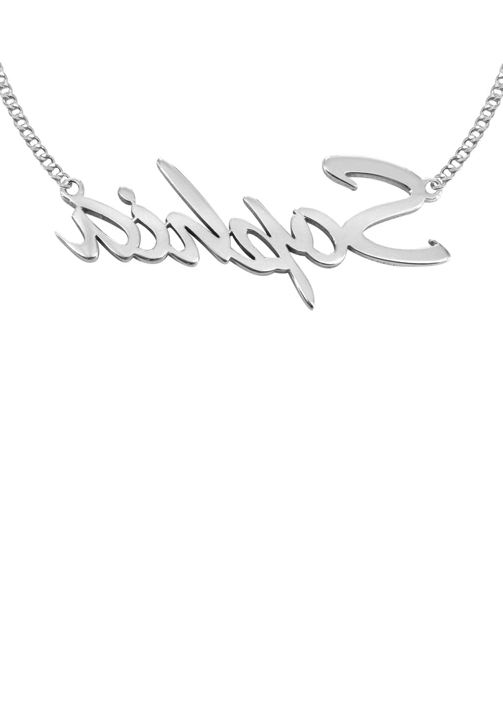 14K Ladies White Gold Name Plate Necklace. The length of the pendant is 0.6 inches and the width is 1.6 inches. The name plate comes with a cuban chain which can be selected to any length above. Due to the custom nature of this product, please allow 10-14 business days for completion.