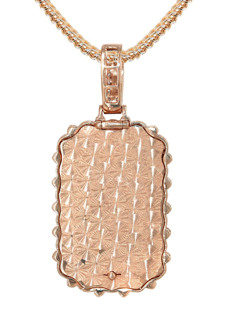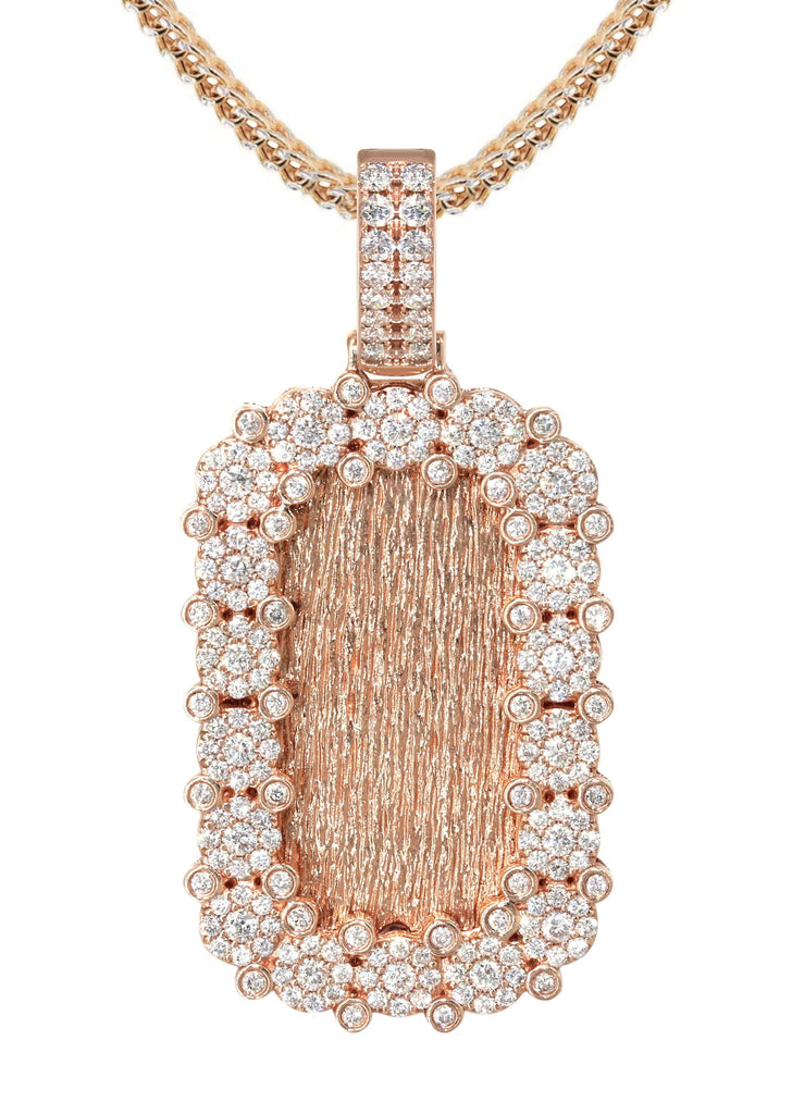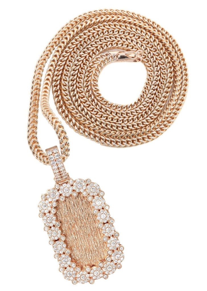 14k Rose gold diamond dog tag pendant & franco chain which comes in 2.1 Inches in length and 1 Inches in width. The pendant weights appx 15.2 grams has 3.22 Carats of Vs quality diamonds.  The chain options include a gold cuban chain, franco or rope with a width of 3mm's and the length can be selected to any preference.