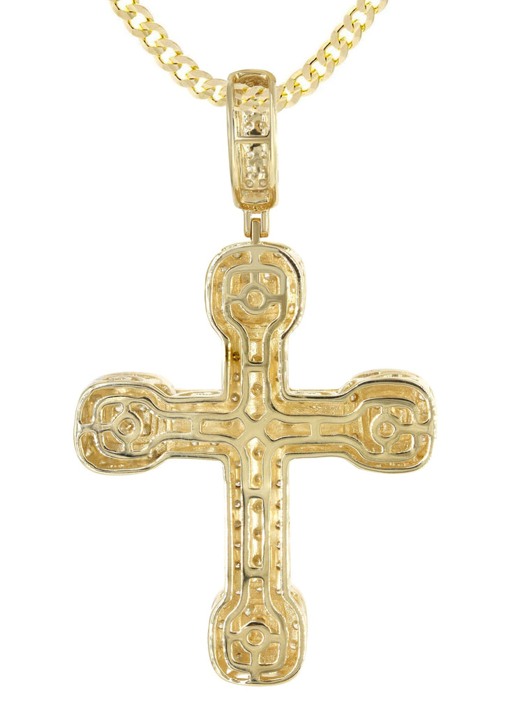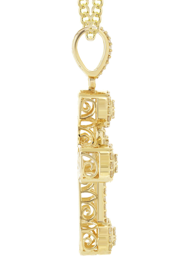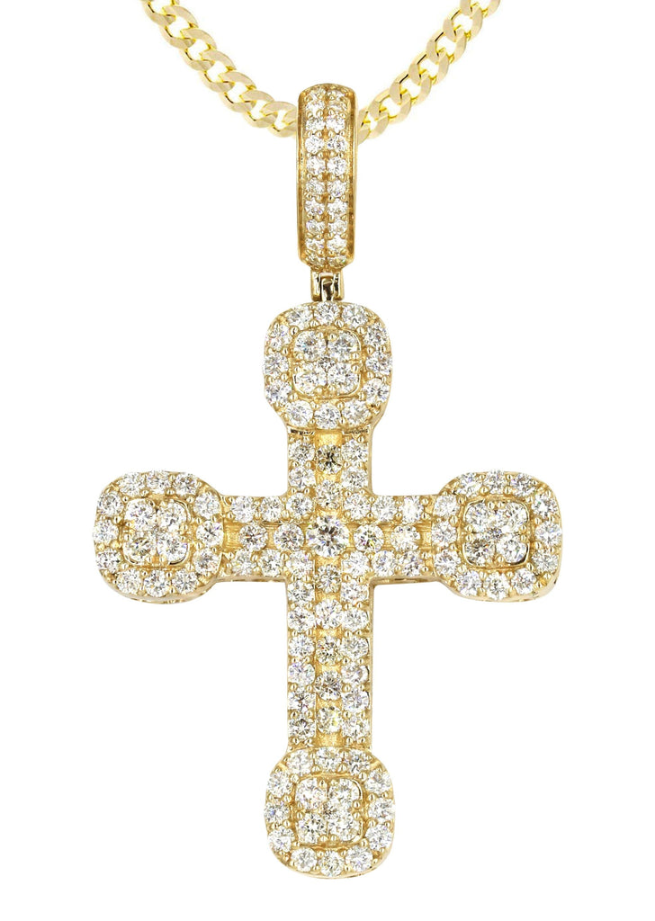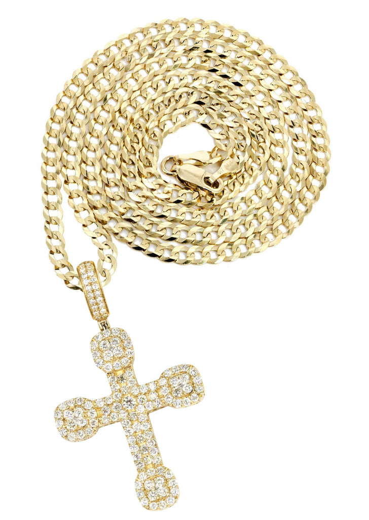 | 14k white gold diamond cross pendant & cuban chain which comes in 1.9 Inches in length and 1.1 Inches in width. The pendant weights appx 9.8 grams has 2.98 Carats of Vs quality diamonds. The chain options include a gold cuban chain, franco or rope with a width of 3mm's and the length can be selected to any preference. |