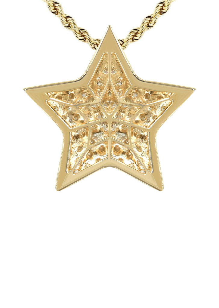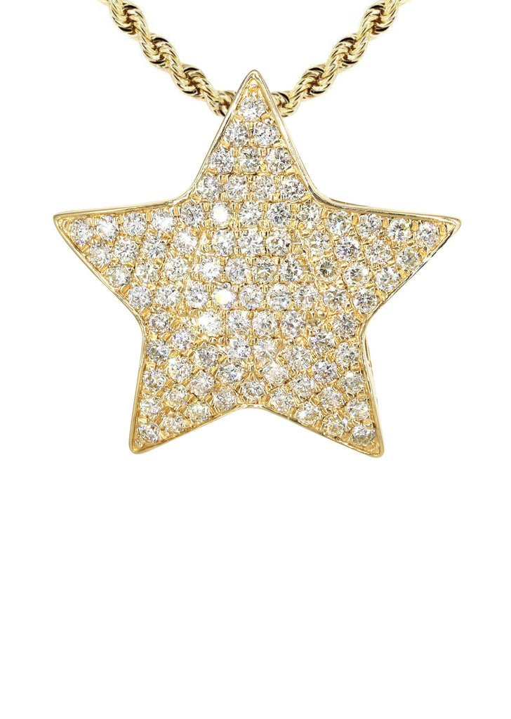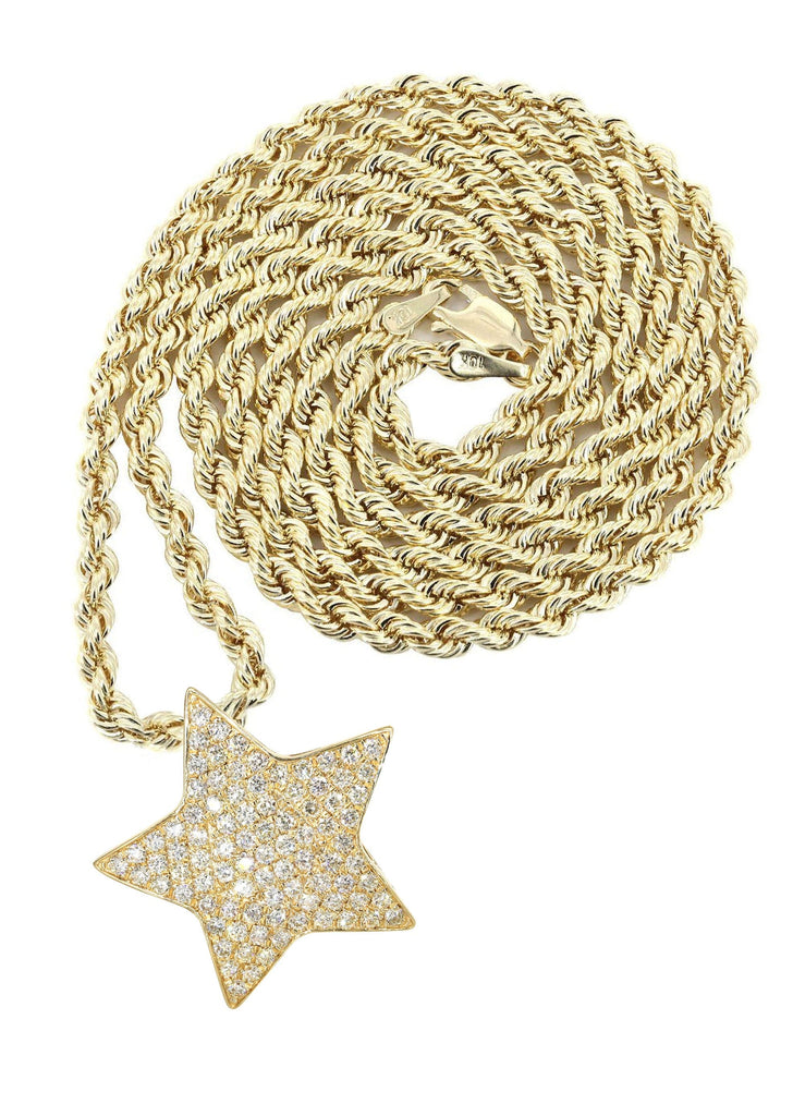 | 14k yellow gold diamond star pendant & rope chain which comes in 1 Inches in length and 1 Inches in width. The pendant weights appx 4.7 grams has 1.65 Carats of Vs quality diamonds. The chain options include a gold cuban chain, franco or rope with a width of 3mm's and the length can be selected to any preference. |