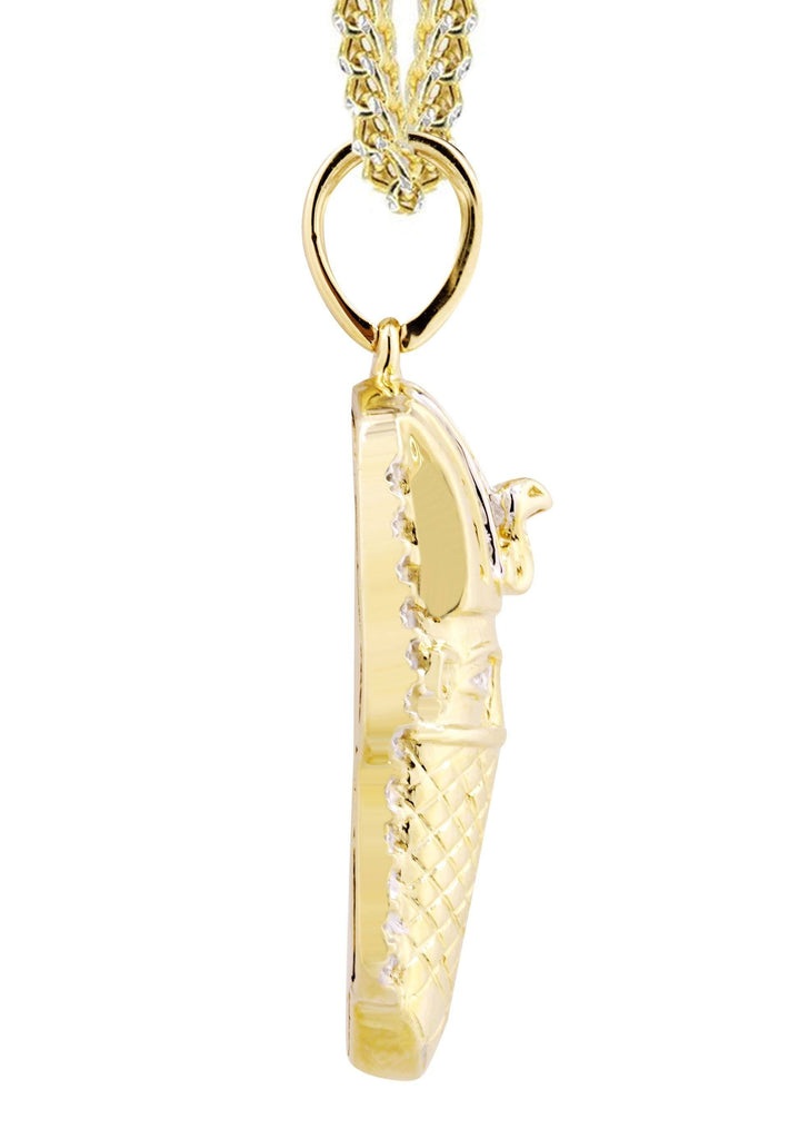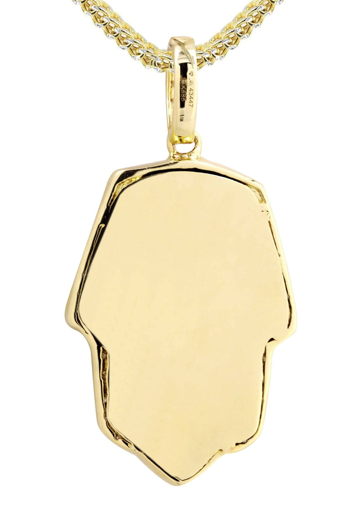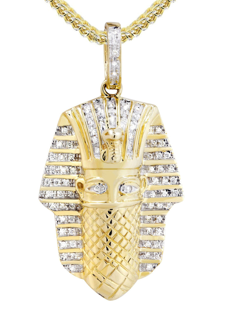 14K Yellow Gold Masked Pharaoh Pendant & Franco Chain With Approximately 0.35 Carats Of Diamonds. The Pendant Width Is 0.9 Inches And The Length Is 1.7 Inches. The Chain Options Include A 10k Gold Cuban Chain, Franco Or Rope With A Width Of 3mm's And The Length Can Be Selected To Any Preference.
