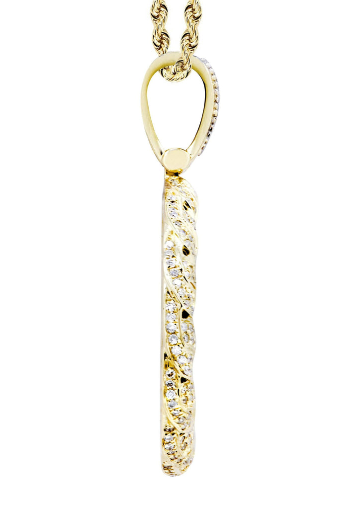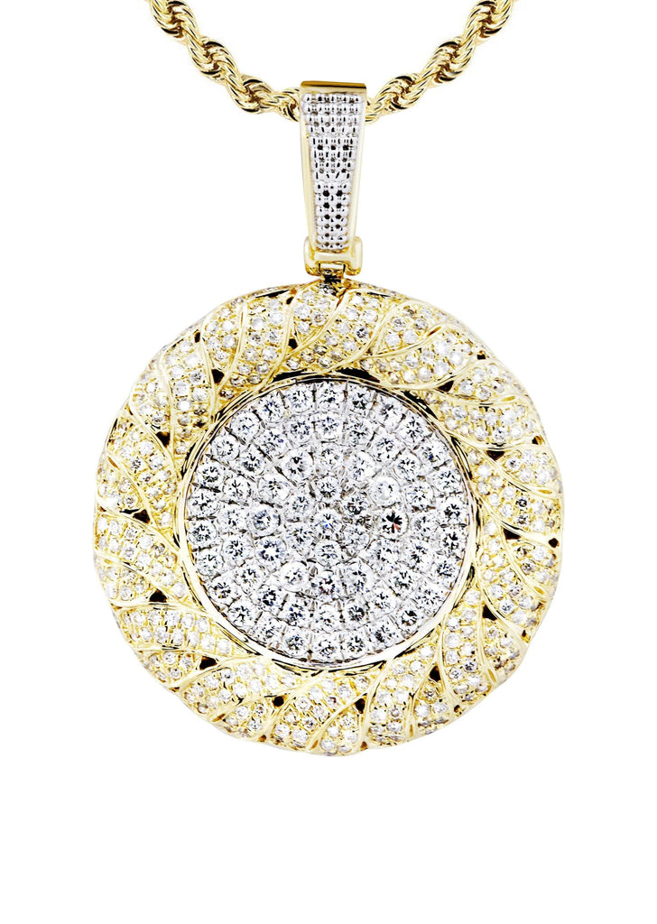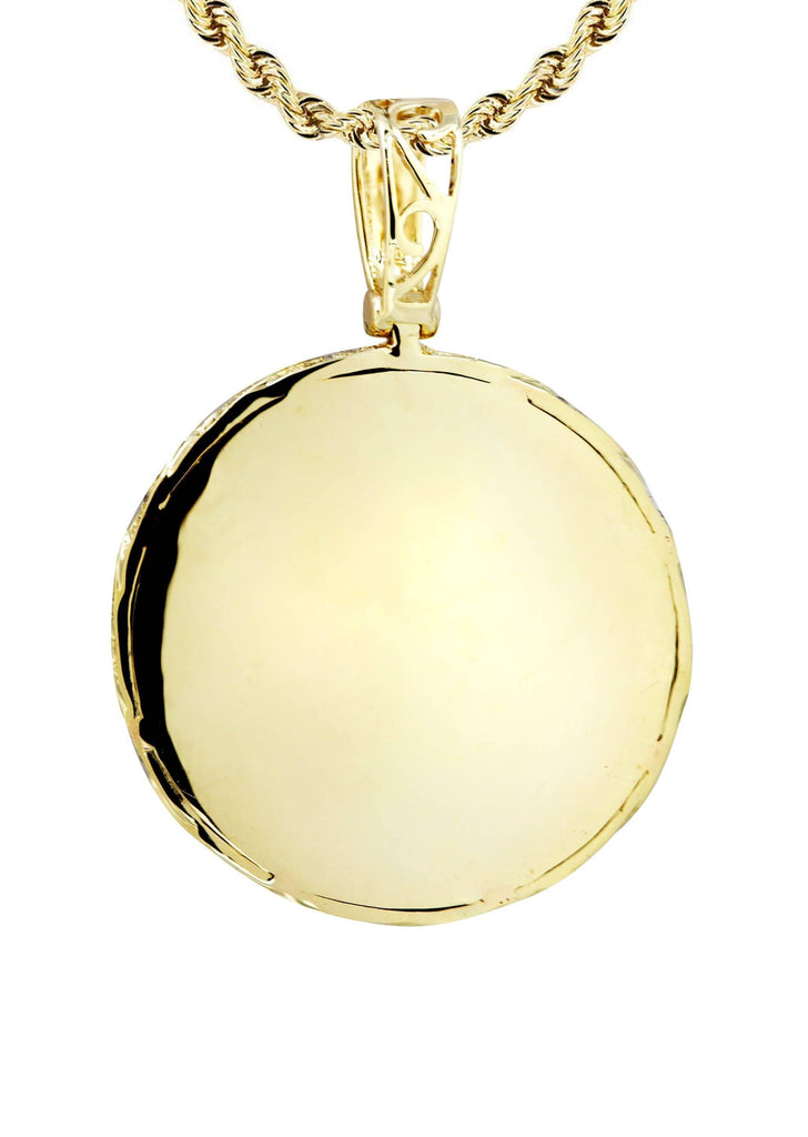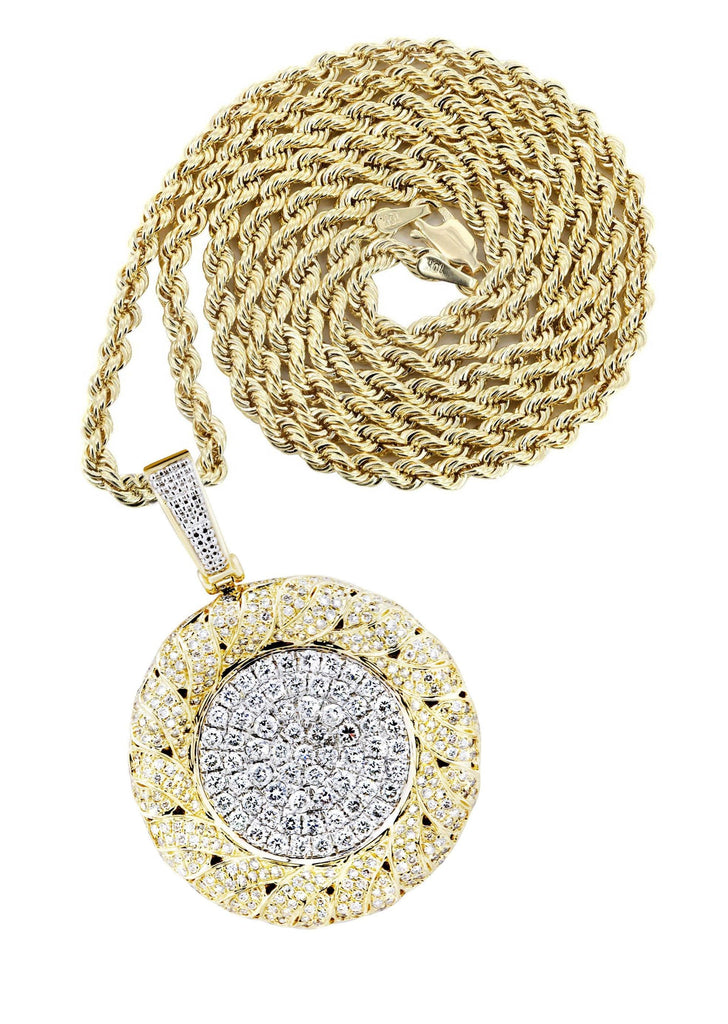 14K Yellow Gold Round Pendant & Rope Chain With Approximately 2.1 Carats Of Diamonds. The Pendant Width Is 1 Inches And The Length Is 1.5 Inches. The Chain Options Include A 10k Gold Cuban Chain, Franco Or Rope With A Width Of 3mm's And The Length Can Be Selected To Any Preference.
