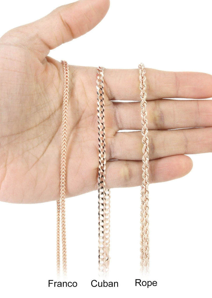 10K or 14K Rose Gold Picture Pendant Necklace which comes in 0.9 Inches in length and 1.3 Inches in width. The chain options include a 10K gold Cuban chain, Franco or Rope with a width of 3 MM and the length can be selected to any preference. Total Gram Weight Is 15.7g. Pendant weighs 5.7 grams and the chain weighs approximately 10 Grams. Upon placing order, we will contact you for a picture to put on the pendant. Due to the custom nature of this product, please allow up to 1 week for production. |