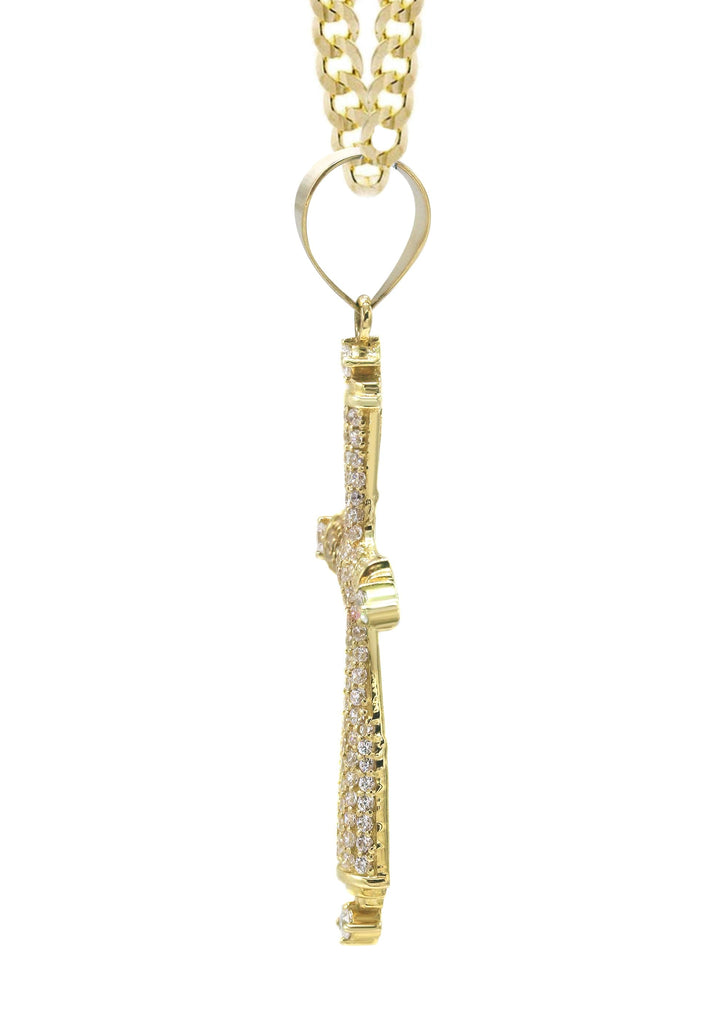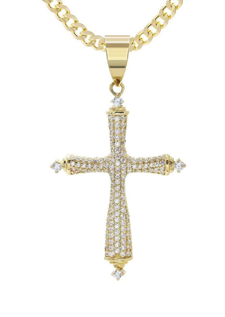 10K Gold Chain And Cz Baguette Cross  Pendant With An Approximate Total Gram Weight Of 16.1. Pendant Weighs 6.1 Grams And The Chain Weighs 10 Grams. The Pendant Measurement Is 1.4 inches In Width And A Length Of 2.5 inches. The Width Of The Chain Is 3 Mm The Length And Type Of The Chain Can Be Adjusted.
