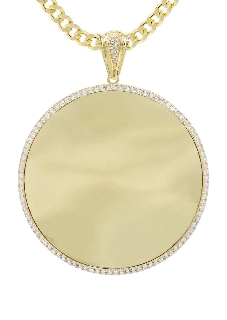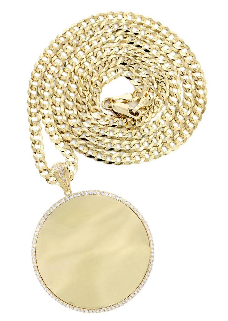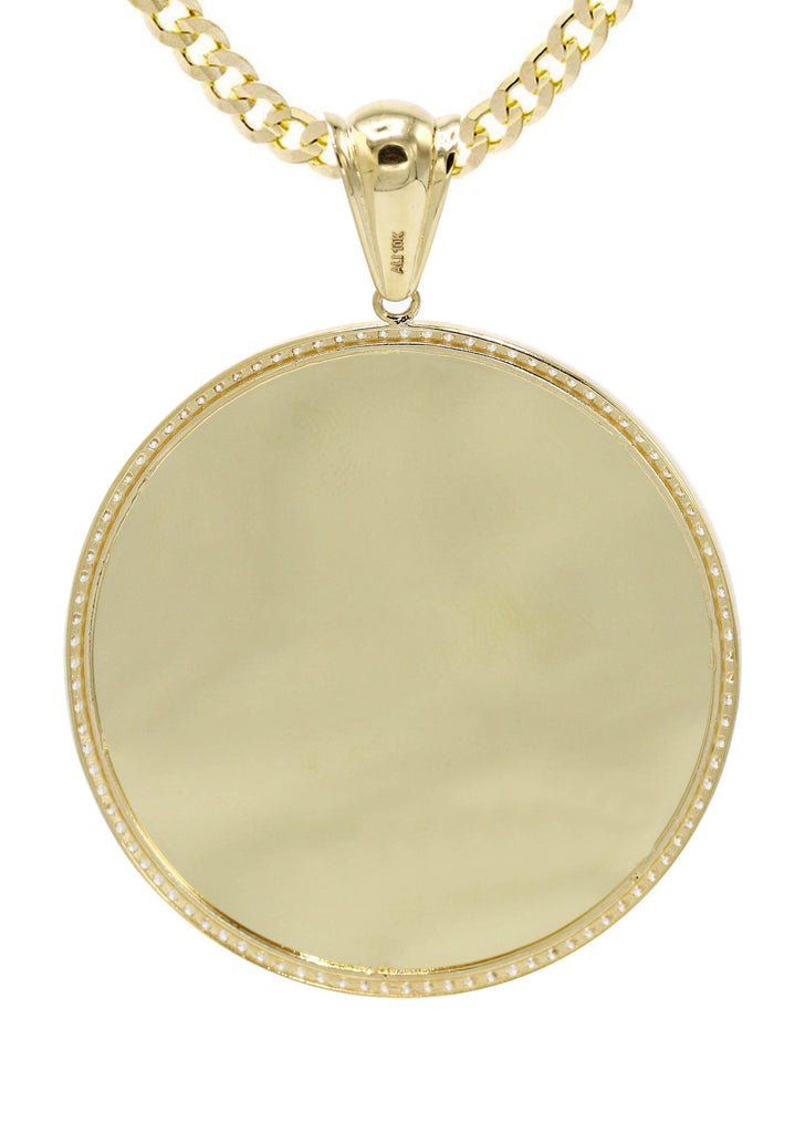10K Yellow Gold Picture Pendant Necklace. The chain options include a 10K gold Cuban chain, Franco or Rope with a width of 3 MM and the length can be selected to any preference. Total Gram Weight Is 25. Pendant weighs 15 grams and the chain weighs approximately 10 Grams. Upon placing order, we will contact you for a picture to put on the pendant. Due to the custom nature of this product, please allow up to 1 week for production. |