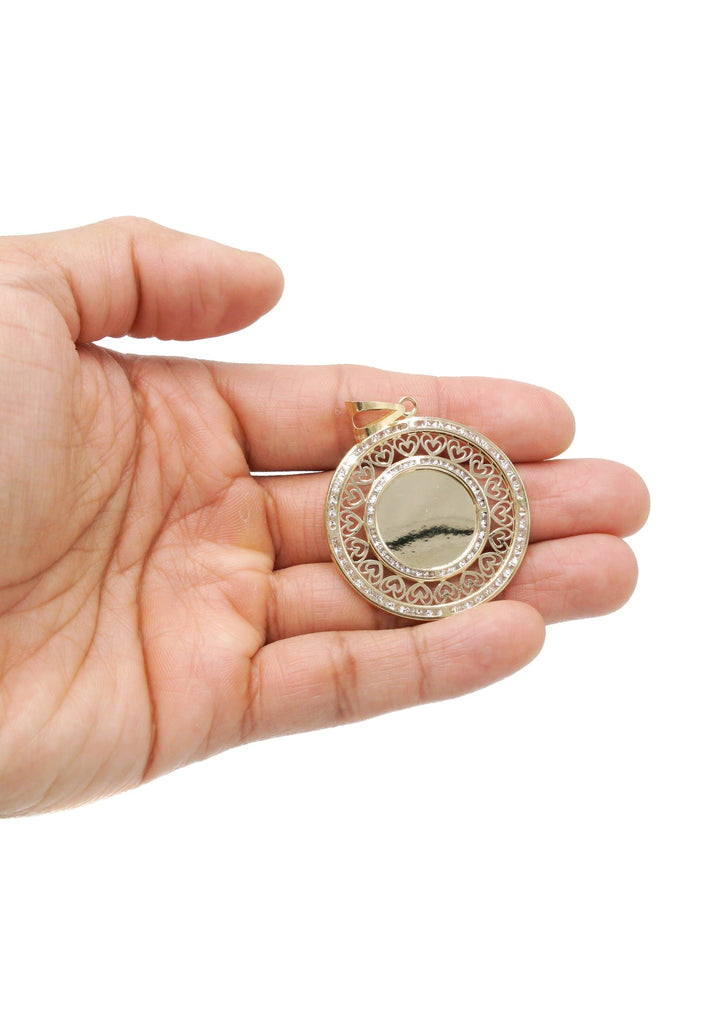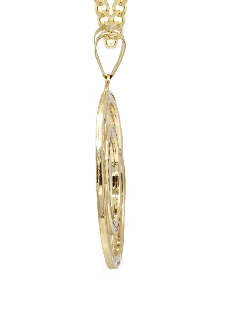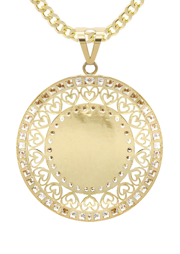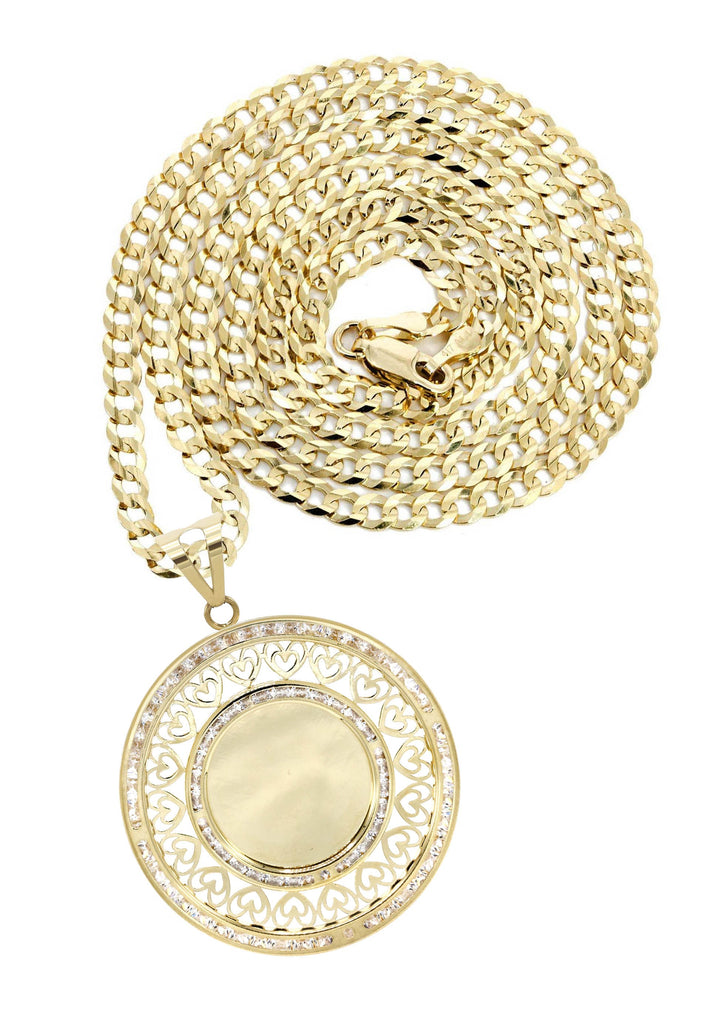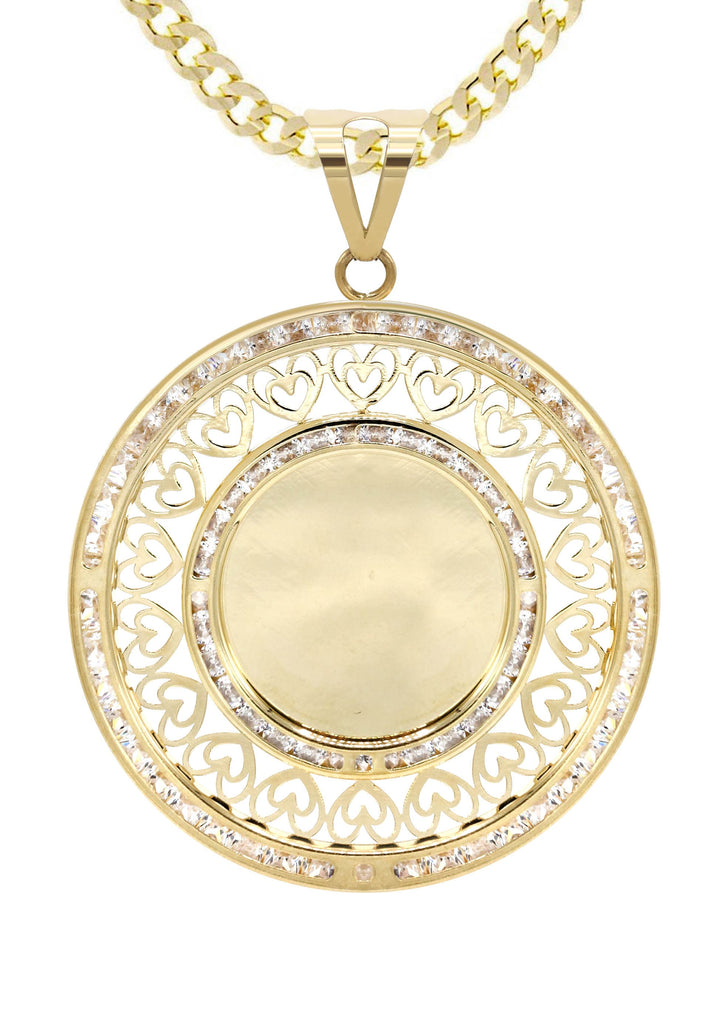 10K Yellow Gold Picture Pendant Necklace. The chain options include a 10K gold Cuban chain, Franco or Rope with a width of 3 MM and the length can be selected to any preference. Total Gram Weight Is 15.6. Pendant weighs 5.6 grams and the chain weighs approximately 10 Grams. Upon placing order, we will contact you for a picture to put on the pendant. Due to the custom nature of this product, please allow up to 1 week for production. |