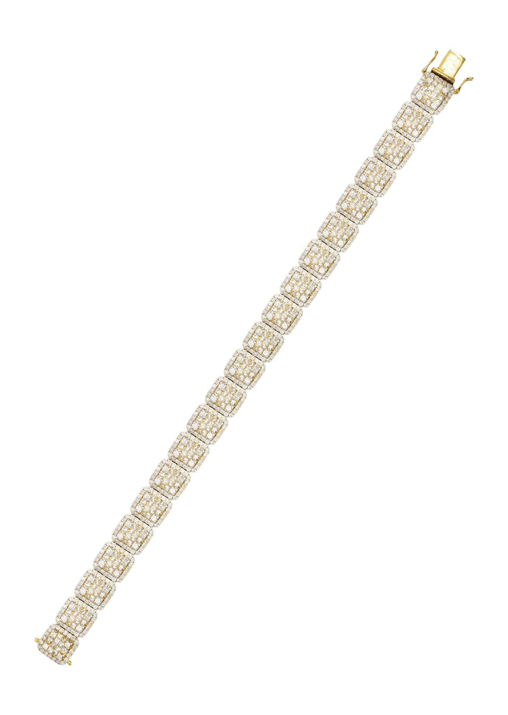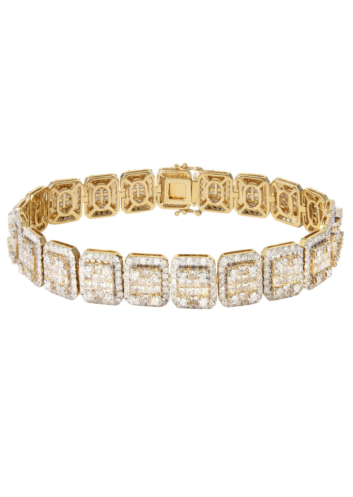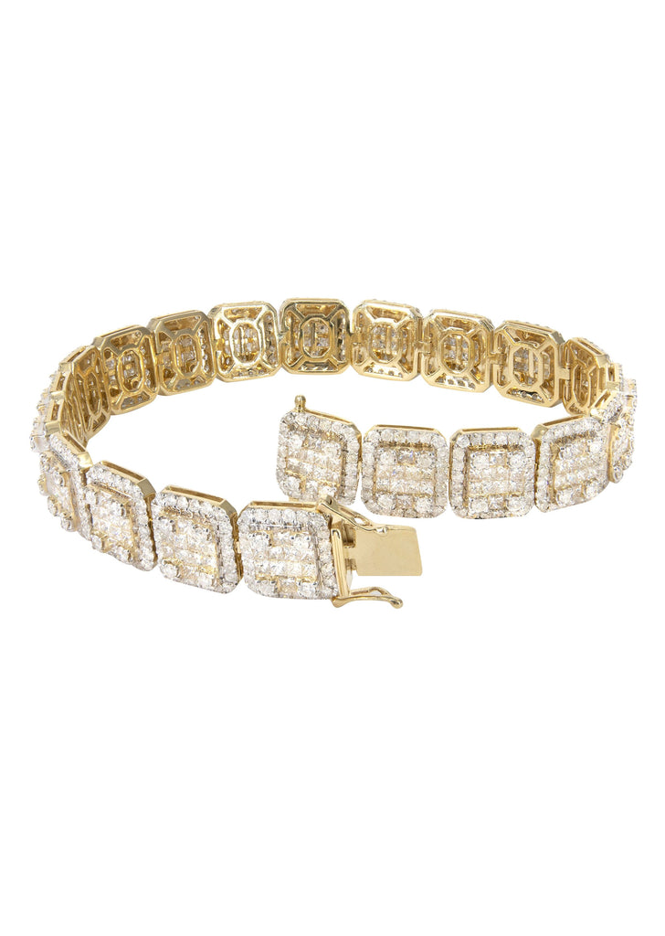 14K Yellow Gold Diamond Cluster Bracelet which measures 8.5 inches. This bracelet has a total of 14.73 carats of VS quality diamonds & F-G in color. The total weight of this bracelet is 34.83 grams.