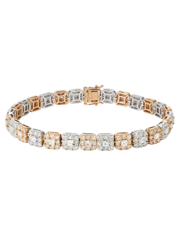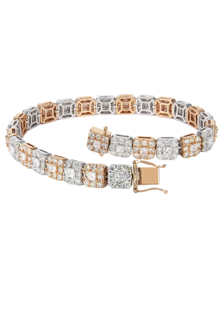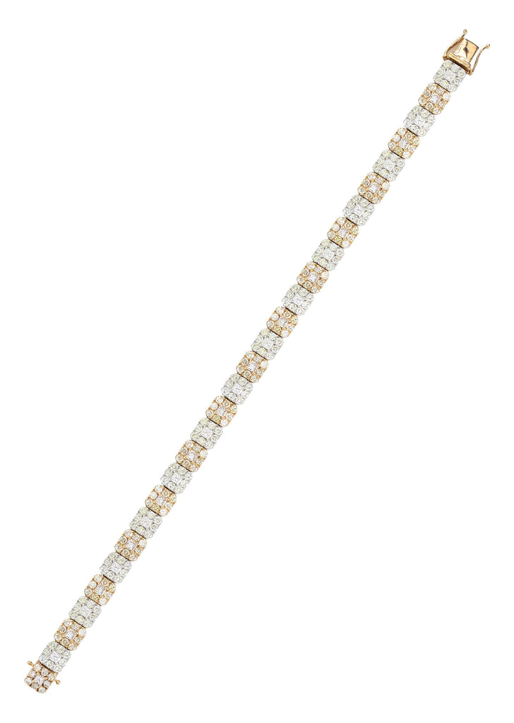 14K Two Tone Diamond Cluster Tennis Bracelet which measures 8.5 inches. This bracelet has a total of 11.64 carats of VS quality diamonds & F-G in color. The total weight of this bracelet is 26.91 grams.