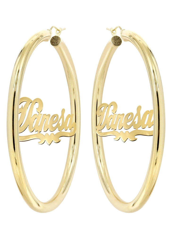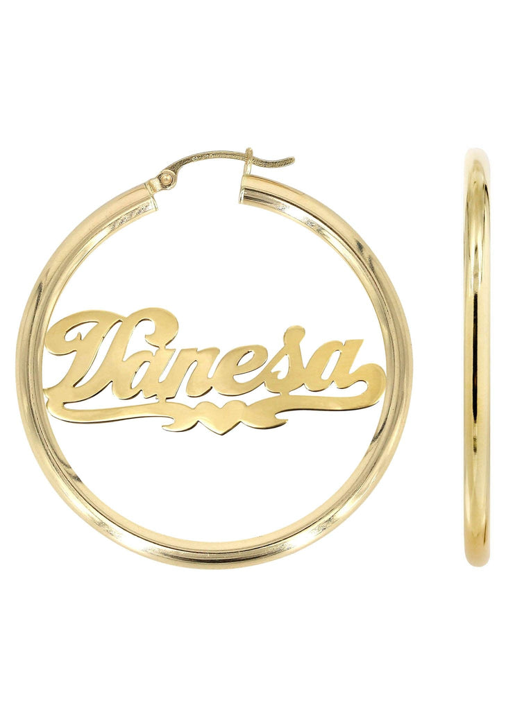 14K Ladies Plain Name Plate Hoop Earrings. The diameter of the hoop earrings can be customized to 1.25 inches, 1.5 inches & 2 inches. Please note that each name plate earring is custom made to order to your specifications so please allow 2-3 weeks for completion. If you have any questions please do not hesitate to call us at 212-730-7879.