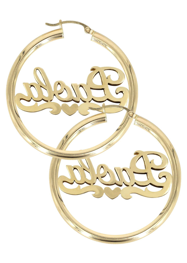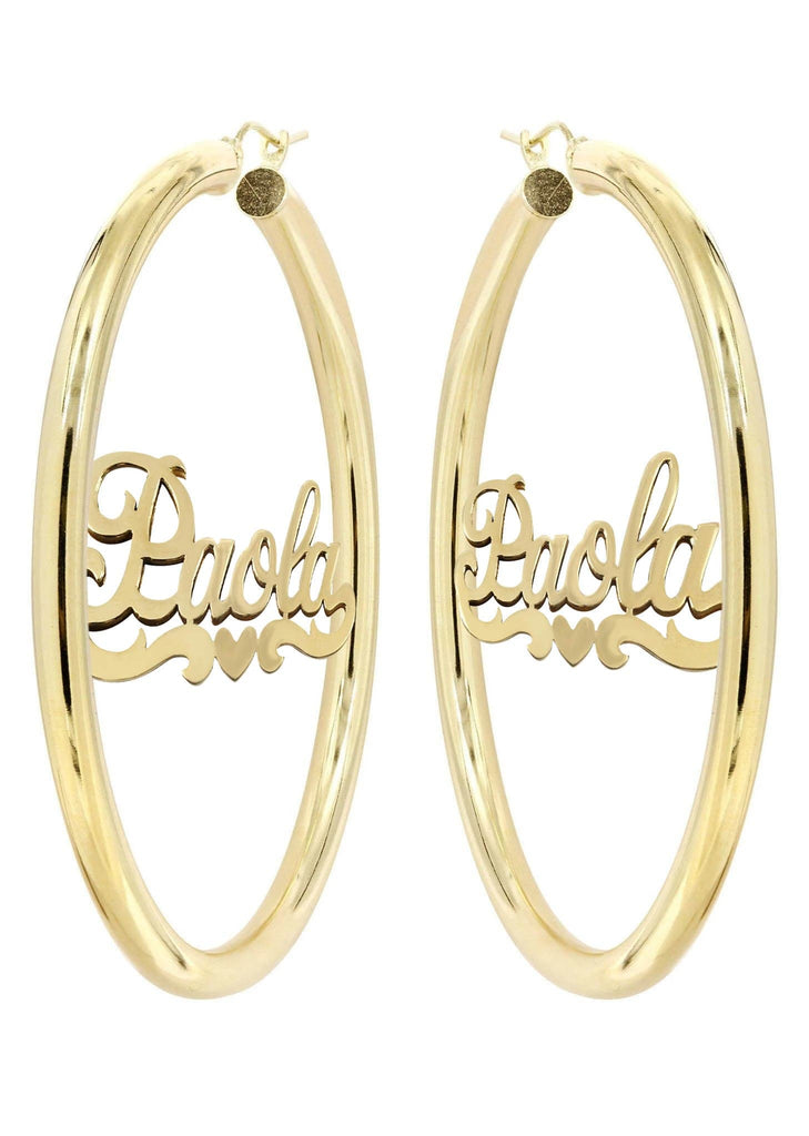 14K Ladies Plain Name Plate Hoop Earrings. The diameter of the hoop earrings can be customized to 1.25 inches, 1.5 inches & 2 inches. Please note that each name plate earring is custom made to order to your specifications so please allow 2-3 weeks for completion. If you have any questions please do not hesitate to call us at 212-730-7879.