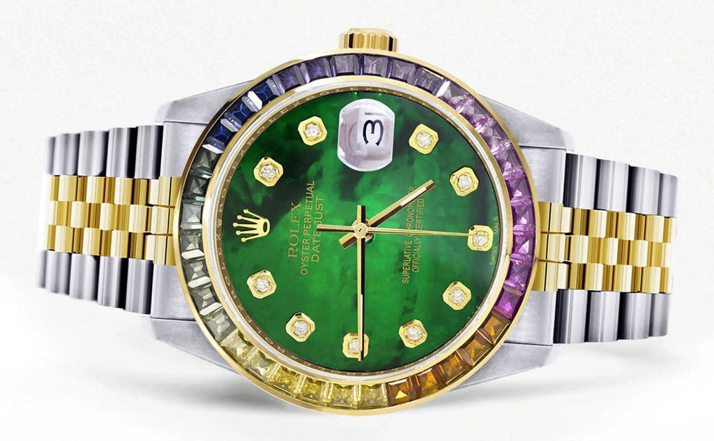 Diamond Gold Rolex Watch For Men 16233 | 36Mm | Rainbow Sapphire Bezel | Green Mother Of Pearl Dial | Jubilee Band