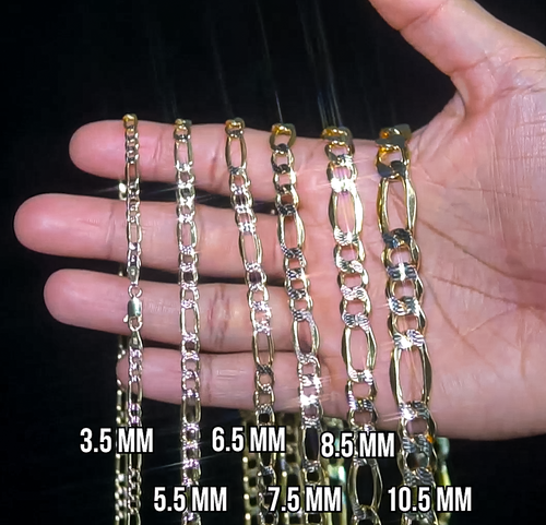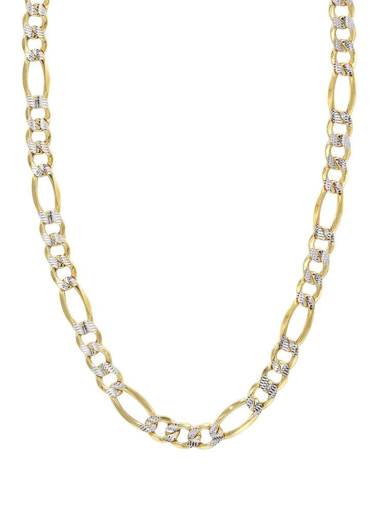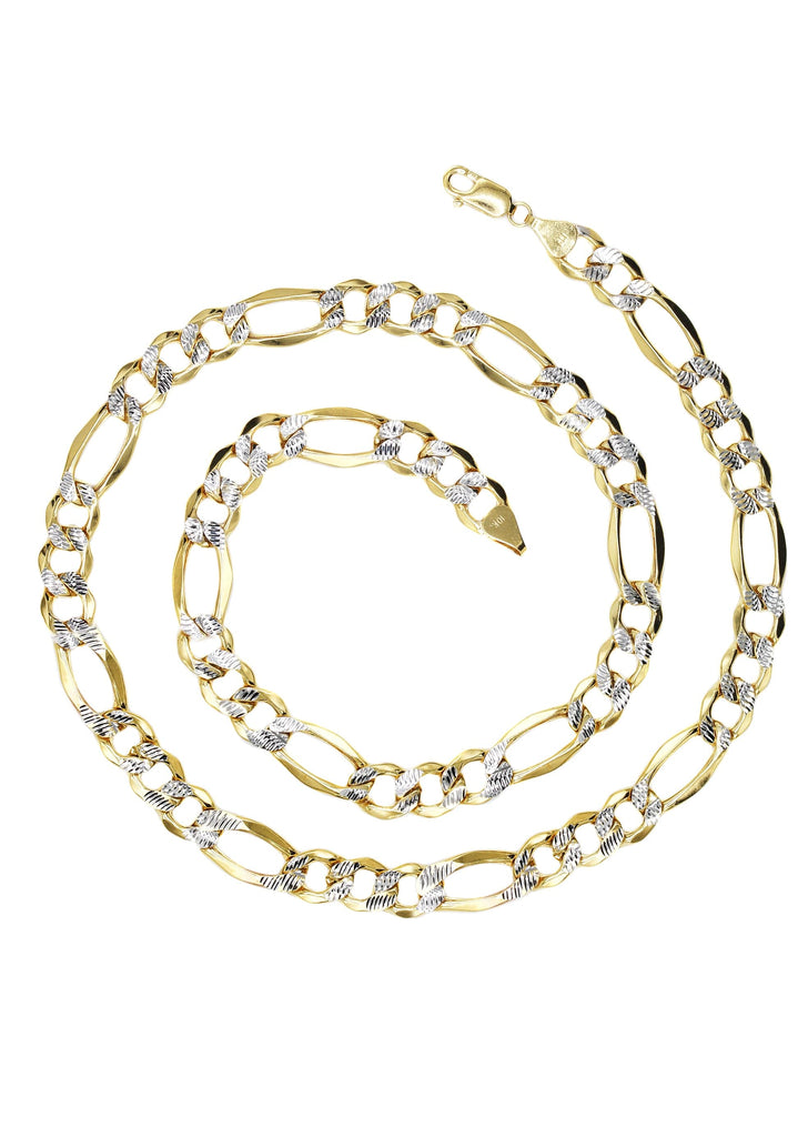 Semi Solid Yellow Gold Diamond Cut Figaro Chain | 10K or 14K Yellow Gold. These chains are fully customizable, so you can pick your gold purity, length and width above. Once you selected your purity, length and width, you can see the adjusted gram weight below the price.
