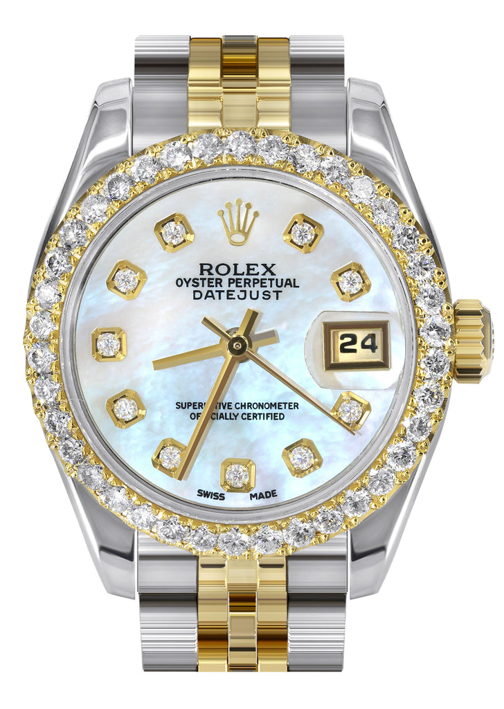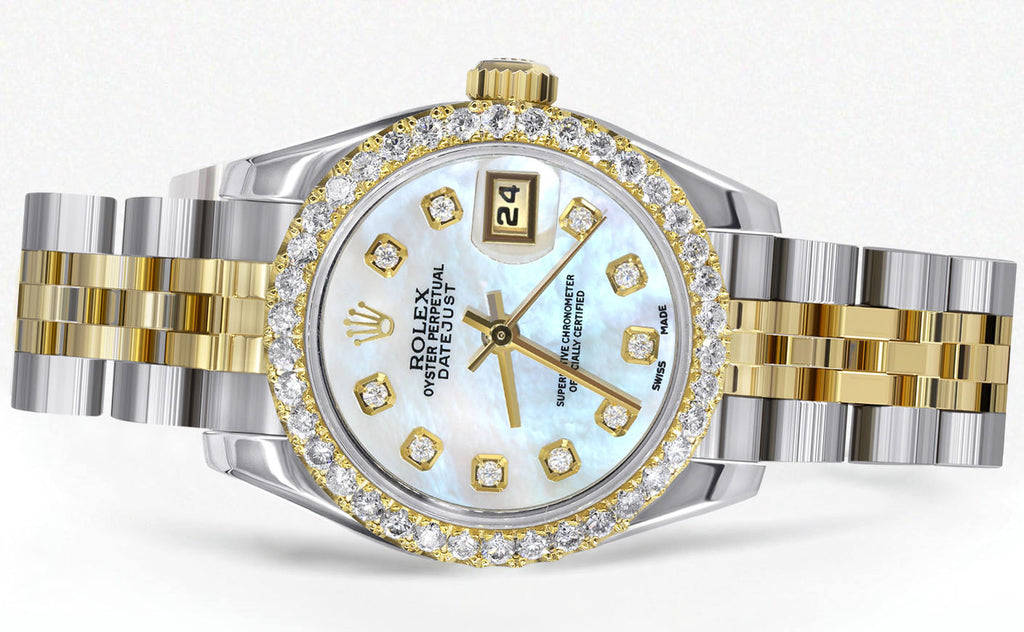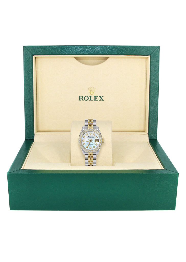 Womens Diamond Gold Hidden Clasp Rolex Watch | 1 Carat Bezel | 26Mm | Light Blue Mother of Pearl Dial | Jubilee Band | Model 179173