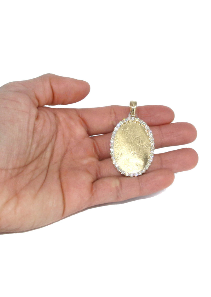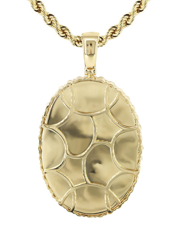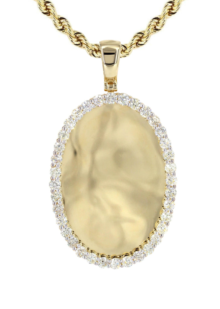 10K Yellow Gold 3.33 Carat Diamond Picture Pendant Necklace. The chain options include a 10K gold Cuban chain, Franco or Rope with a width of 3 MM and the length can be selected to any preference. Total Gram Weight Is 23. Pendant weighs 13 grams and the chain weighs approximately 10 Grams. Upon placing order, we will contact you for a picture to put on the pendant. Due to the custom nature of this product, please allow up to 1 week for production. |