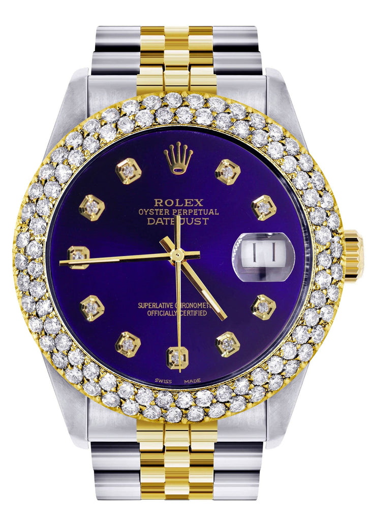 Diamond Gold Rolex Watch For Men 16233 | 36Mm | Royal Blue Dial | Two Row 4.25 Carat Bezel | Jubilee Band